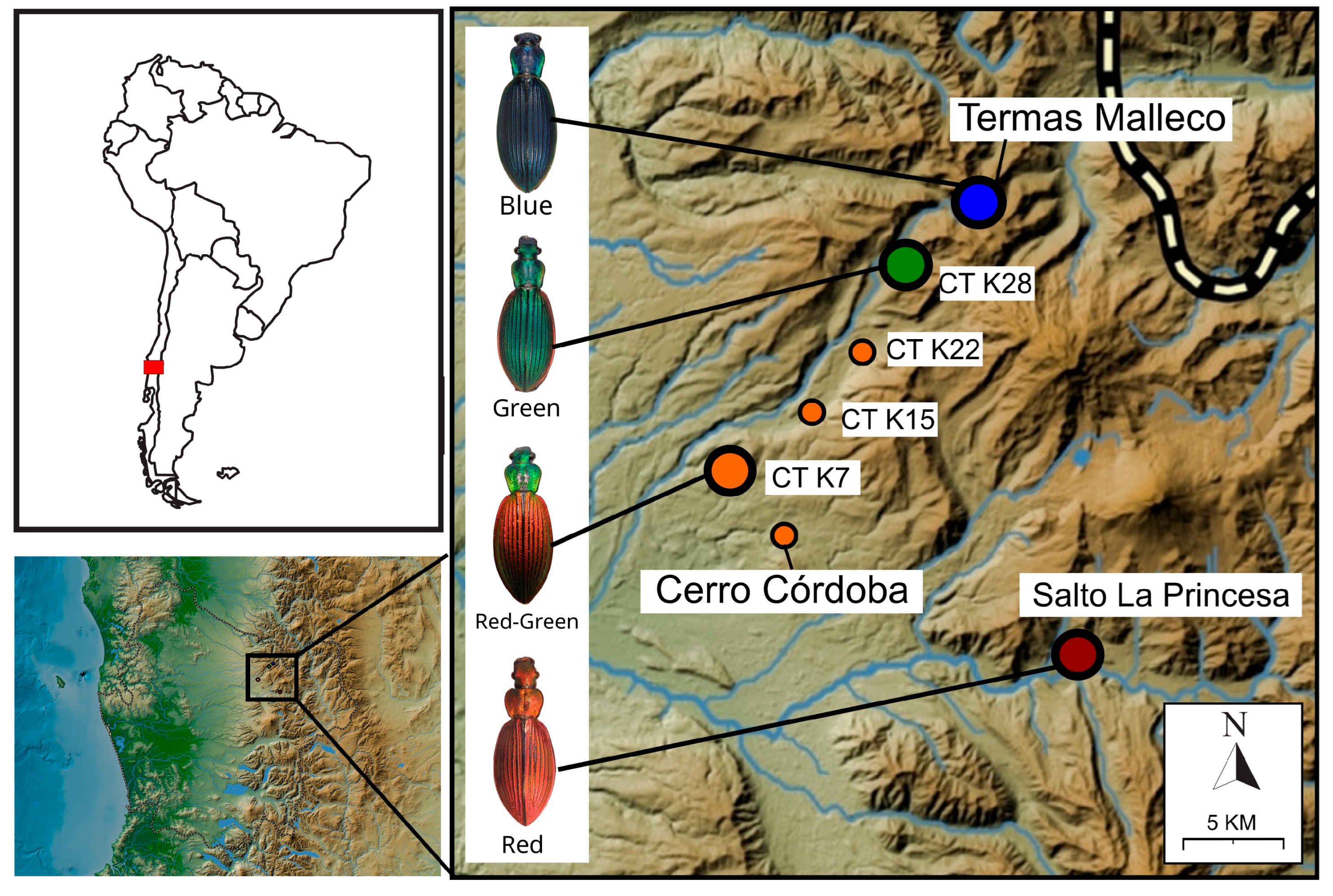 - López-López, A.; Acosta, V.; Rataj, L.; Galián, J. Evolution and diversification of the Southern Chilean genus Ceroglossus (Coleoptera, Carabidae) during the Pleistocene glaciations. Syst. Entomol. 2021, 46, 856–869. [Google Scholar] [CrossRef]