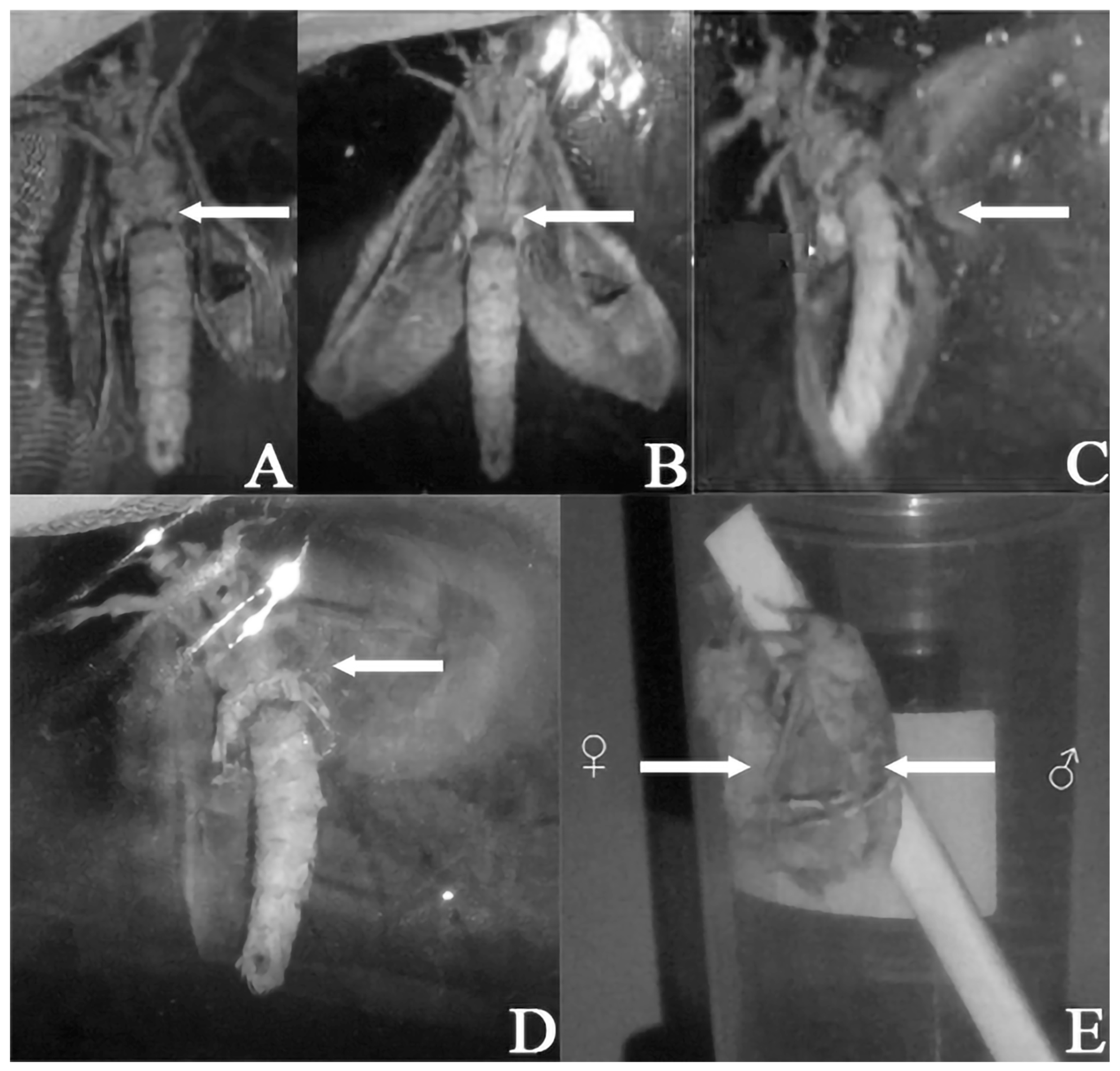 | The end of the calling | Both the male and female moths enter a stage of excitement and mutual approach, characterized by high-frequency wing flapping and abdominal twisting as they attempt to bring their abdominal tips into contact with each other (Figure 1D). At this point, the male moth approaches the female and hooks its legs onto the ventral side of the female’s chest. When the abdominal tips of the male and female moths come into contact, they enter the mating state (Figure 1E). | |
