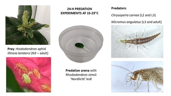 C. carnea, demonstrated effective predation on rhododendron aphids at a relatively low temperature of 15 °C. These findings indicate the potential of these predators to suppress aphid outbreaks early in the growing season. However, further validation under open-field conditions is required to confirm the results of our laboratory study.