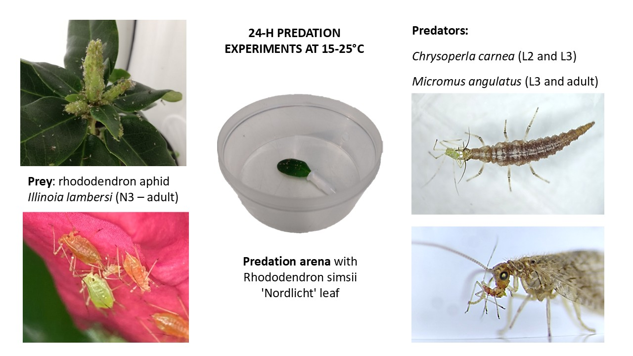 R. simsii ‘Nordlicht’. This cultivar, characterized by relatively smooth leaf surfaces, provided minimal physical barriers to predator movement and feeding. However, the applicability of these findings to other rhododendron cultivars requires careful consideration. Many commercially important cultivars possess dense glandular trichomes on their leaves, which may impede predator locomotion, reduce prey encounter rates, or alter foraging efficiency [