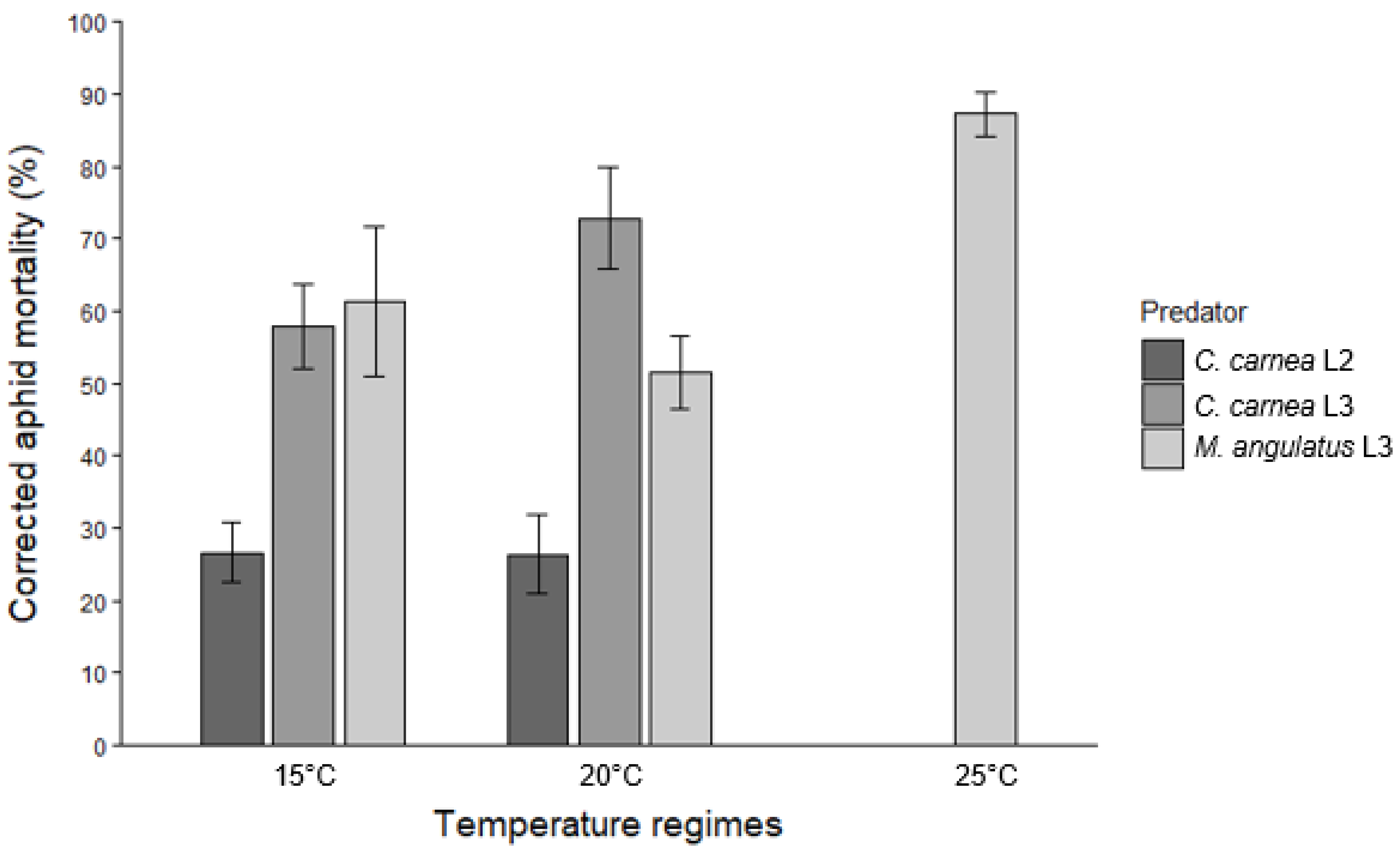 C. carnea, second-instar larvae (L2) caused corrected aphid mortality rates of 26.6 ± 4.2% at 15 °C and 26.3 ± 5.4% at 20 °C, while third instars caused higher mortality, amounting up to 57.9 ± 5.8% of the aphids offered at 15 °C and 72.8 ± 7.0% at 20 °C (