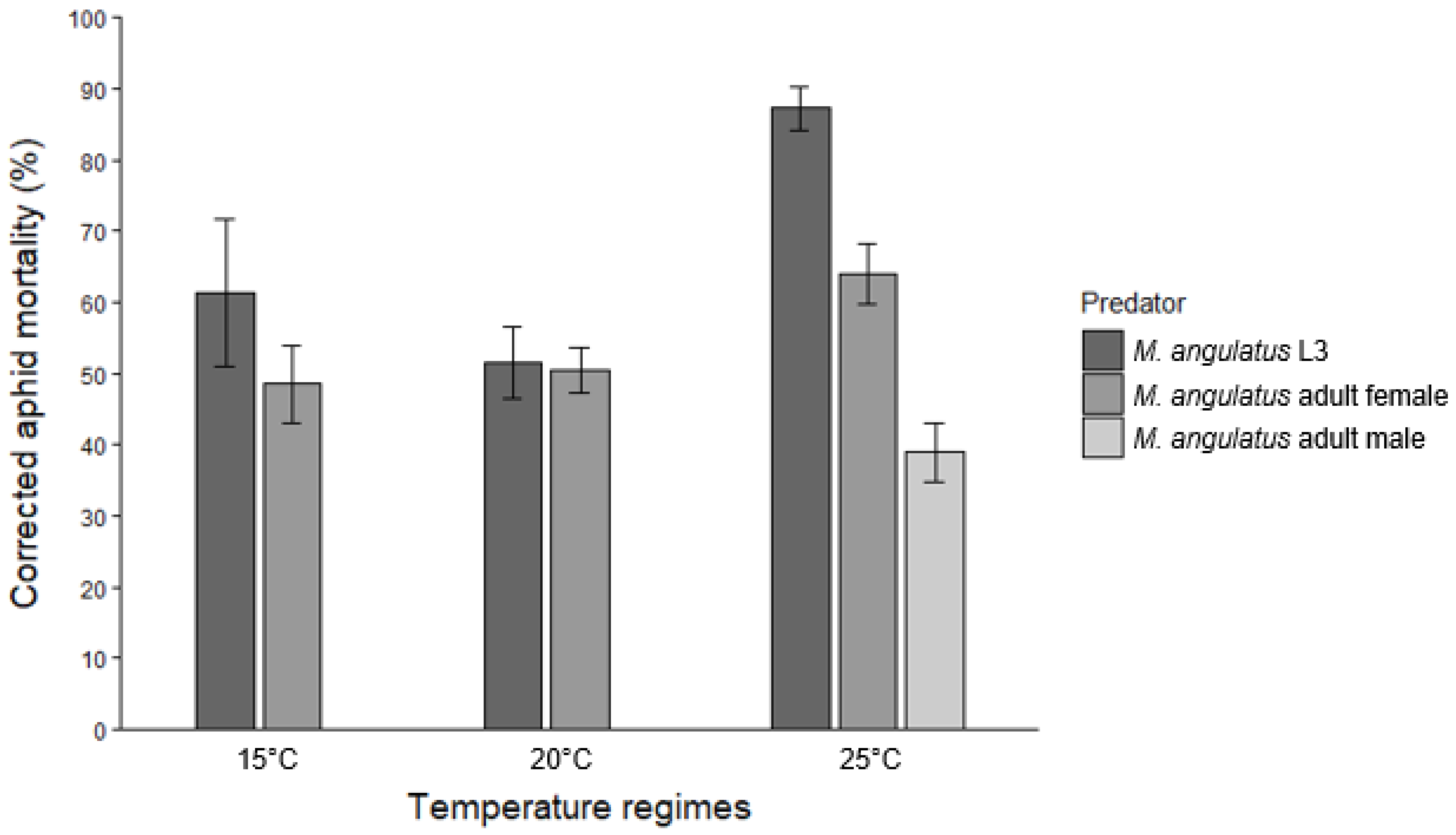 M. angulatus led to corrected aphid mortality rates of 48.5 ± 5.4%, 50.5 ± 3.2%, and 63.9 ± 4.3% at the respective temperatures. Male adults, which were only tested at 25 °C, killed 38.9 ± 4.1% of the aphids offered (