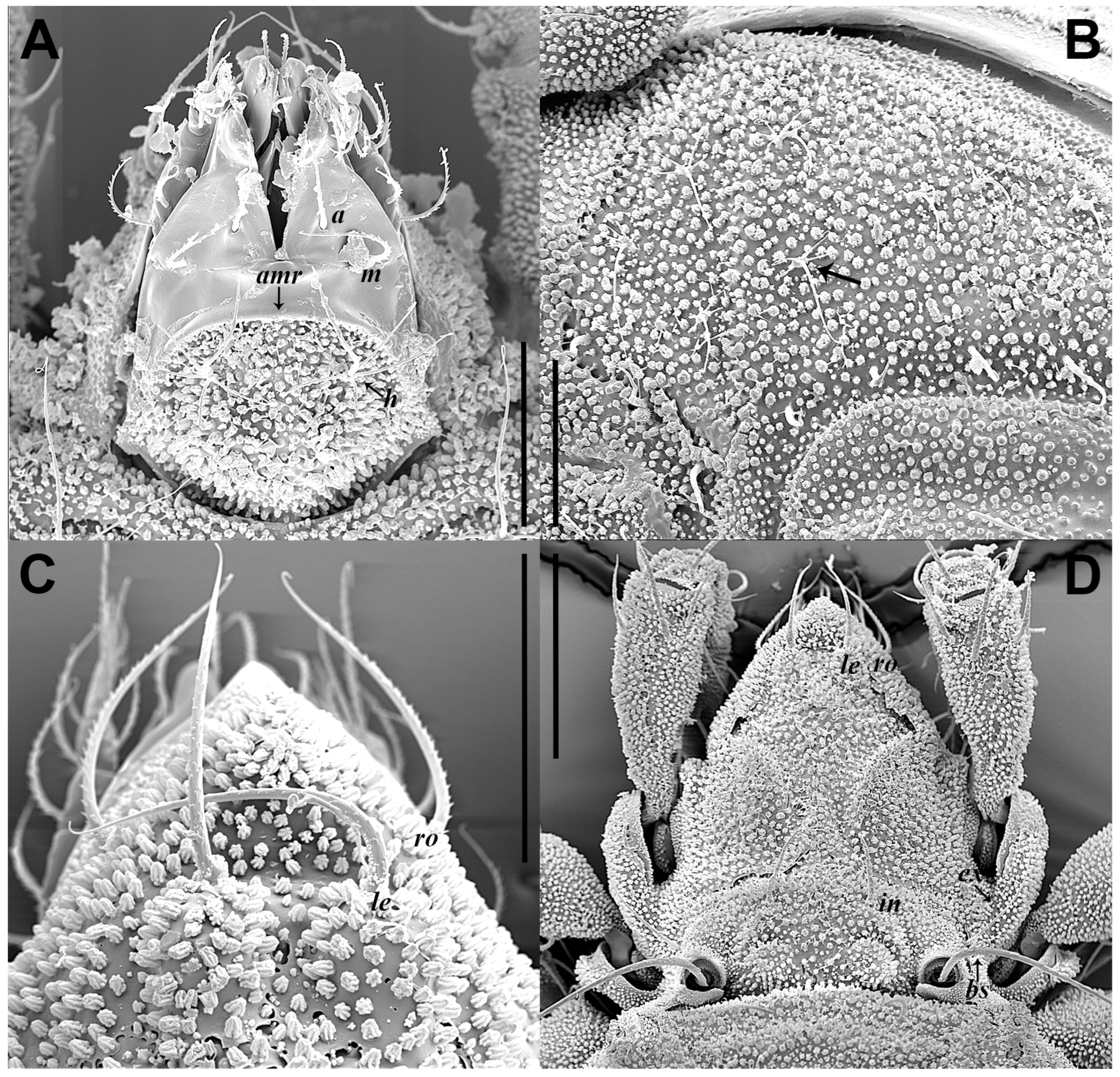 - Seniczak, S.; Ivan, O.; Kaczmarek, S.; Seniczak, A. Morphological ontogeny of Eremobelba geographica (Acari: Oribatida: Eremobelbidae), with comments on Eremobelba Berlese. Syst. Appl. Acarol. 2021, 26, 749–768. [Google Scholar] [CrossRef]
