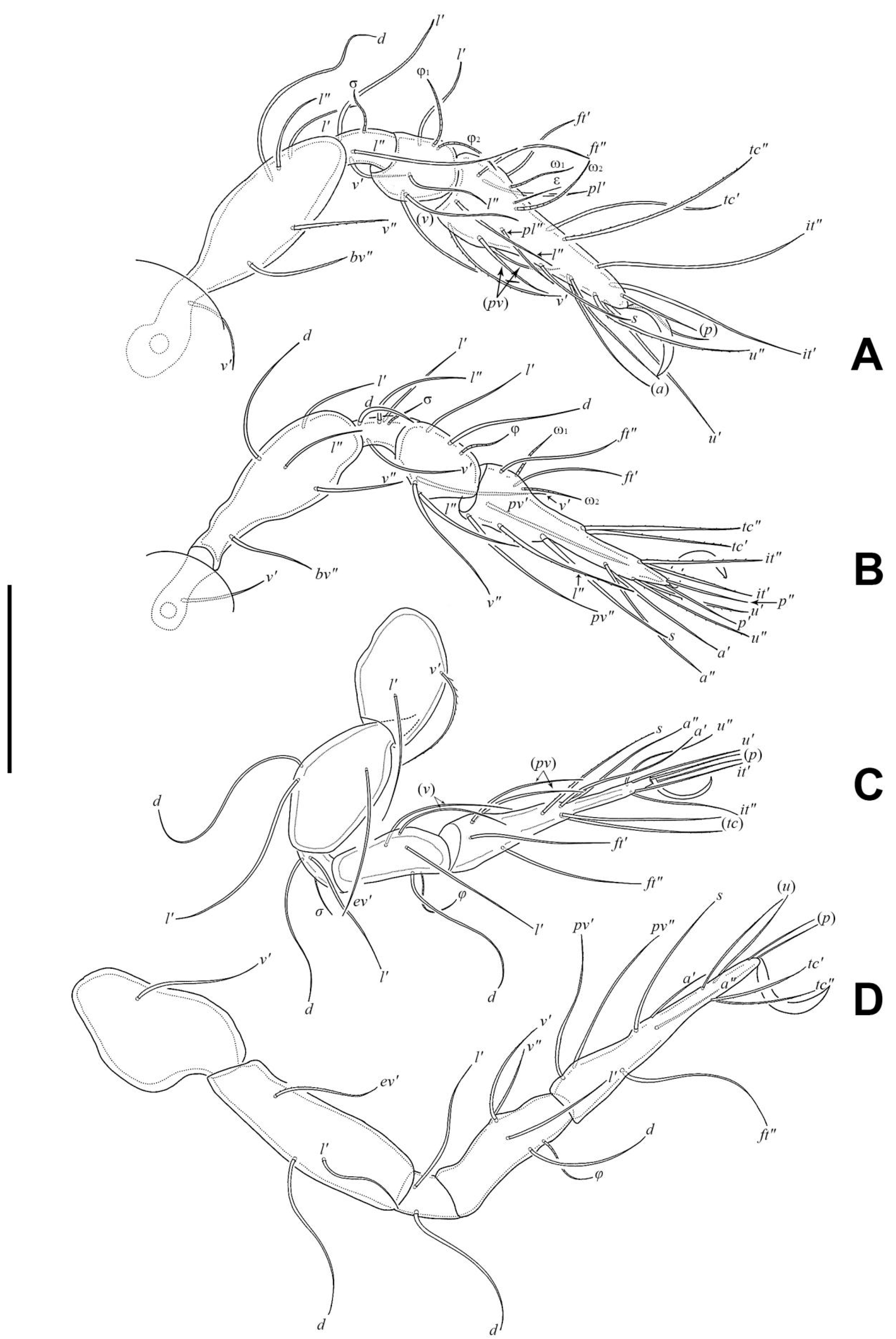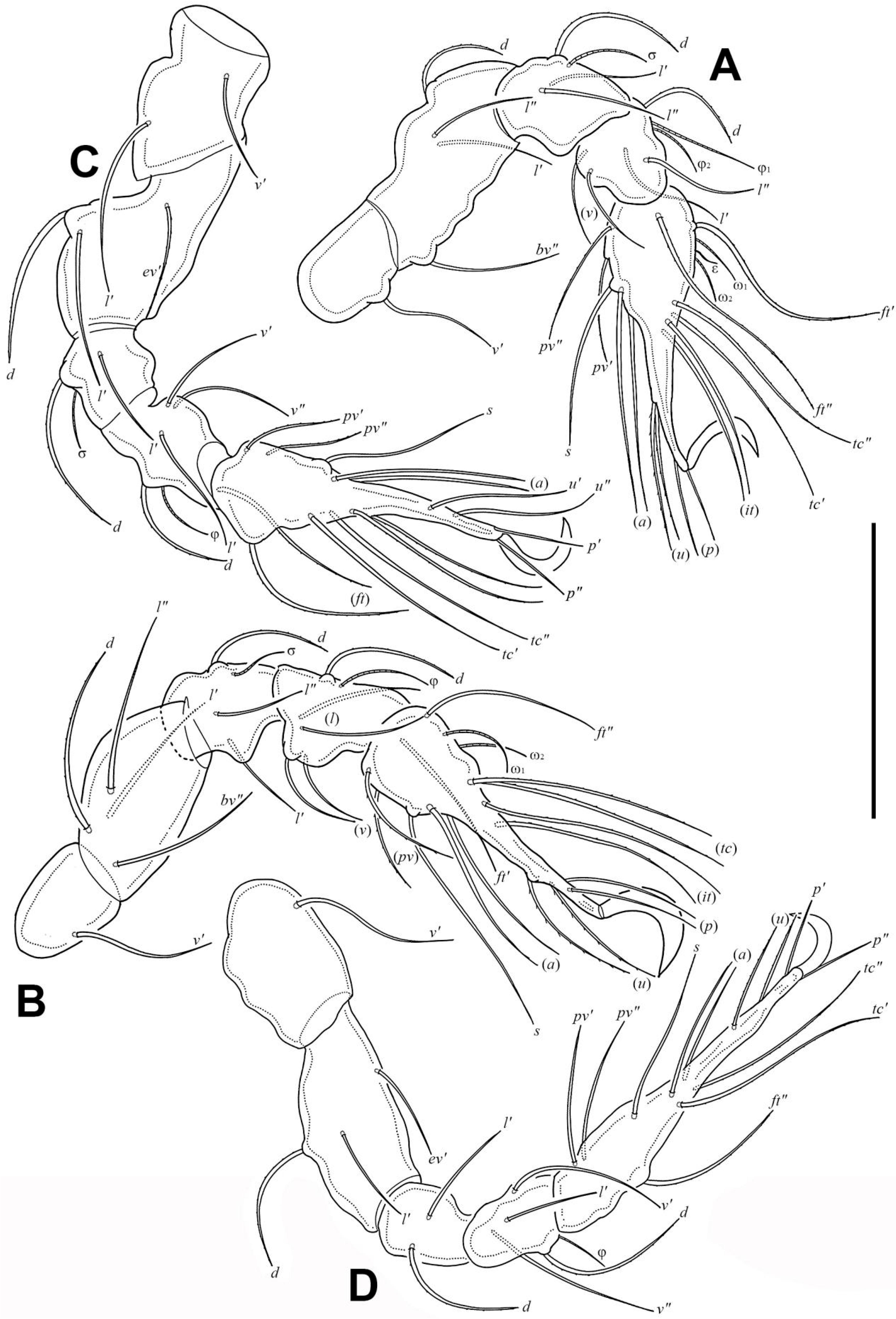 - Norton, R.A. A Review of F. Grandjean’s System of Leg-Chaetotaxy in the Oribatei and Its Application to the Damaeidae. In Biology of Oribatid Mites; Dindal, D.L., Ed.; State University of New York, College of Environmental Science and Forestry: Syracuse, NY, USA, 1977; pp. 33–62. [Google Scholar]