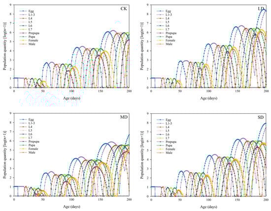 Based on the life table data generated by TWOSEX-MSChart, population projections were conducted using TIMING-MSChart to assess how the rearing of P. nuda on F. microcarpa subjected to different levels of drought stress affects its 200-day population dynamics [32].