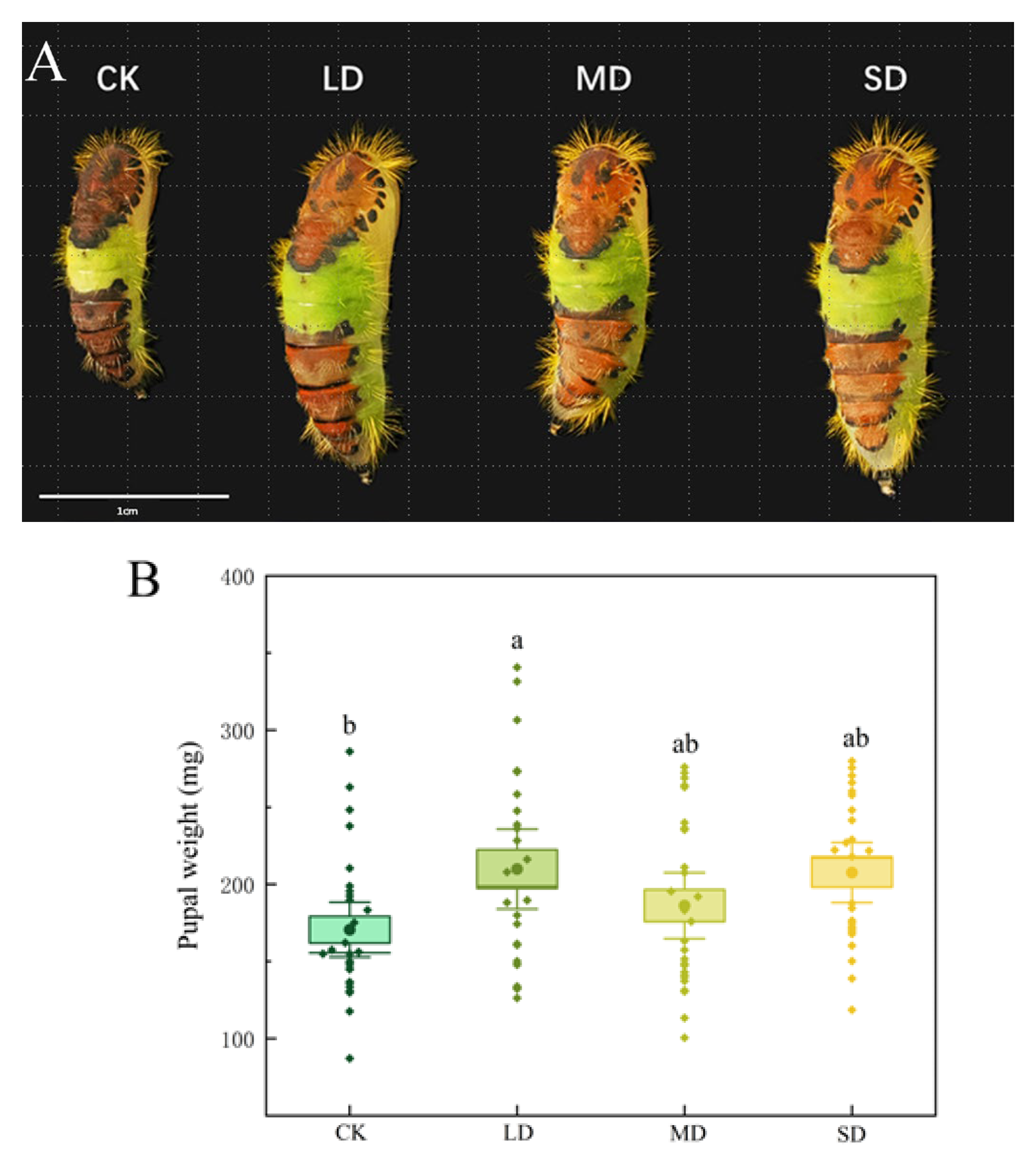 | 4th instar | 29 | 4.79 ± 0.16 a | 29 | 4.38 ± 0.12 b | 30 | 4.47 ± 0.15 ab | 29 | 4.55 ± 0.16 ab |