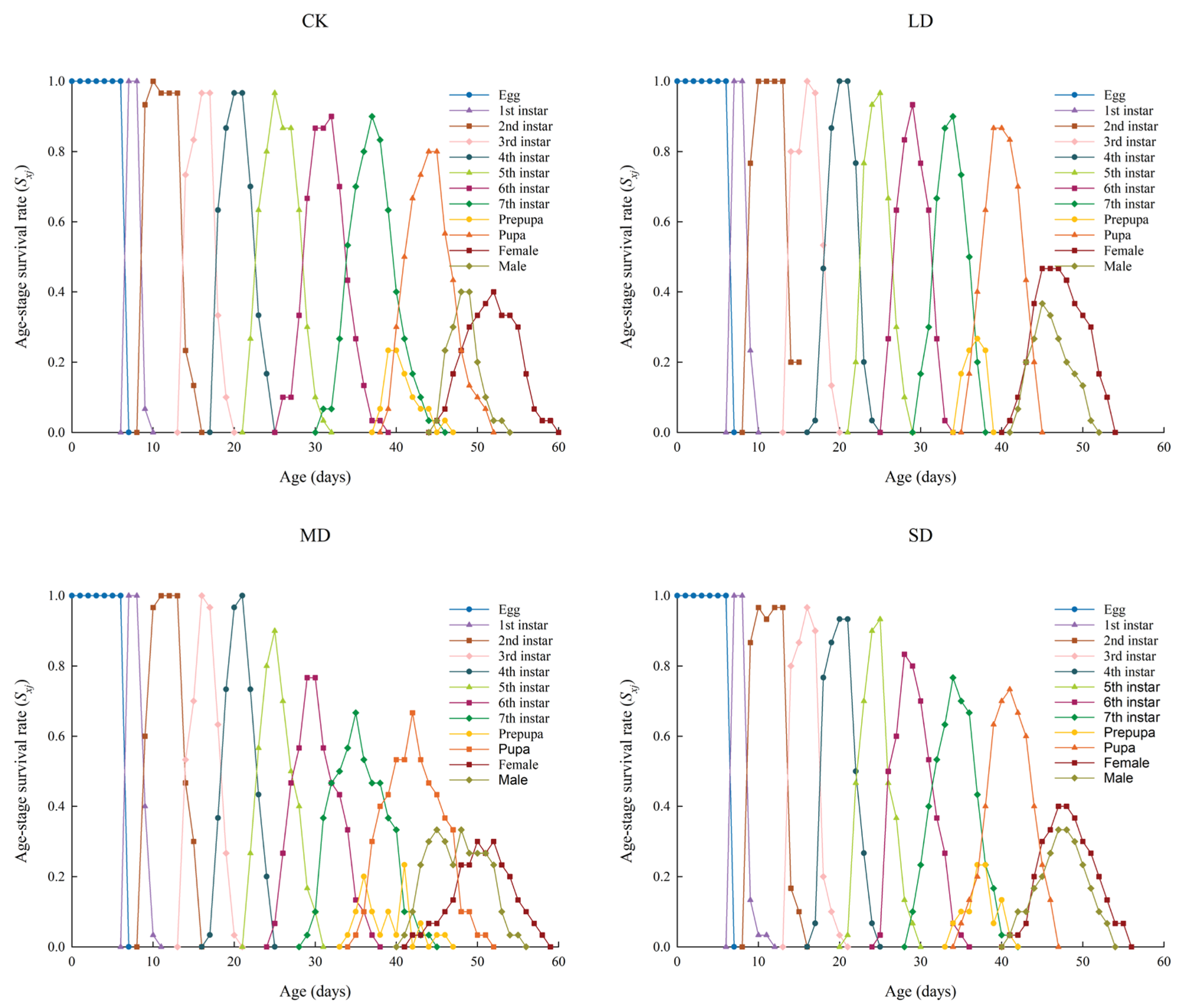 - Chi, H. Life-table analysis incorporating both sexes and variable development rates among individuals. Environ. Entomol. 1988, 17, 26–34. [Google Scholar] [CrossRef]