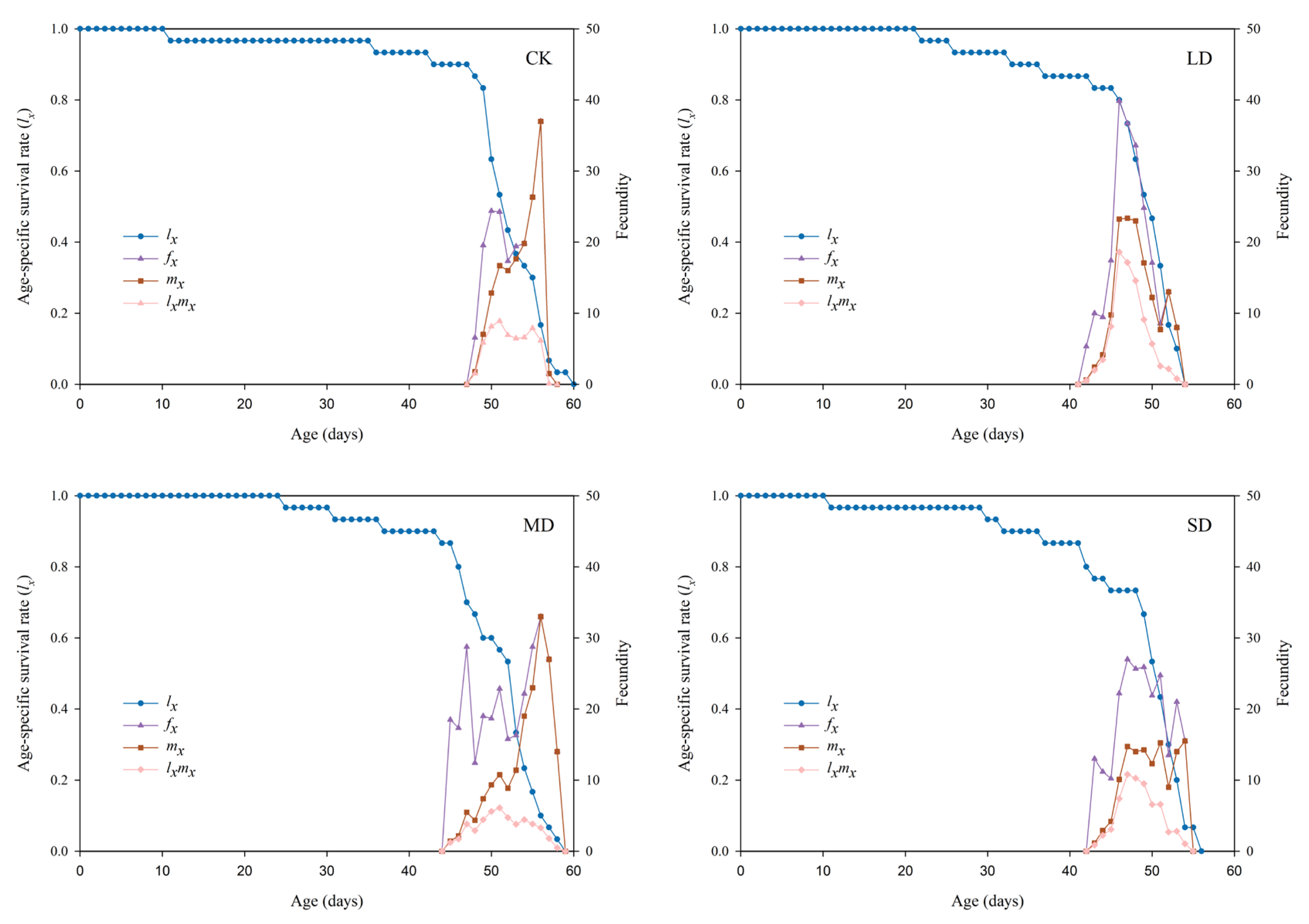 | Finite rate of increase (λ/day) | 1.08 ± 0.00 b | 1.10 ± 0.00 a | 1.08 ± 0.01 b | 1.09 ± 0.01 ab |