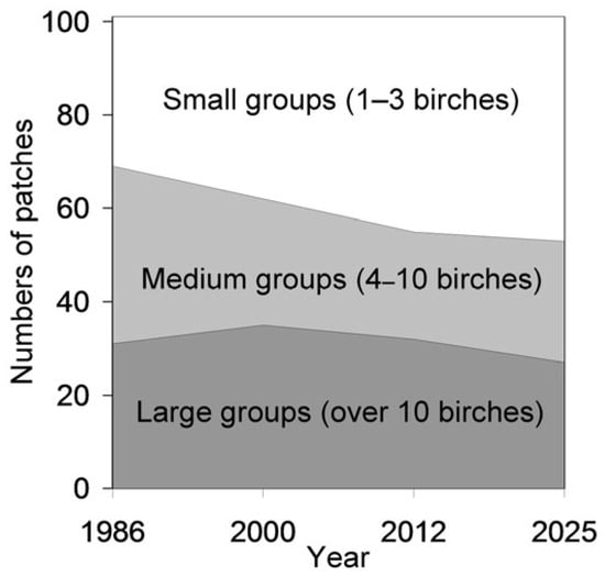 A subsequent decrease in the number of birch-occupied cells aligns with previous findings of a temporal shift in birch population trends in St. Petersburg—from an increase in 1986–2000 to a decline over the past two decades [13]. However, this decline did not reduce birch occurrence in the Petrogradsky district to the level observed in 1986. Contrary to our Hypothesis 2, grid-cell data indicate an overall increase in birch occurrence over the past 40 years (Figure 4). This conclusion may be spatially limited, as our observations revealed local extinctions in 23% of the patches in which birches had been present in 1986 (Figure 1). This trend is further reflected in the growing proportion of small birch groups (1–3 individuals), which increased from 32% in 1986 to 48% in 2025 (Figure 2). The concurrent decline in both the number and size of birch-occupied patches suggests an increase in population fragmentation, which may reduce connectivity among birch groups [57,58] and compromise dispersal corridors for birch-feeding insects.
