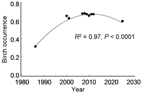 The tree species composition in the green areas of St. Petersburg has undergone significant changes over decades and centuries. During the 1950s–1960s, poplars (Populus spp.) were planted most intensively, and by the start of our study in the 1980s, they had become the most abundant tree species in the city [56]. In the 1970s–1980s, limes (Tilia spp.) accounted for 25% and maples (Acer spp.) for 17% of all seedlings cultivated in city nurseries, whereas birches (Betula spp.) comprised only about 5% [57]. However, by the mid-1990s, the proportion of birches among newly planted trees increased to 25–30% [26]. This trend is corroborated by our data showing a doubling in the proportion of grid cells that have a birch presence in the Petrogradsky district of St. Petersburg between 1986 and 2000 (Figure 4).