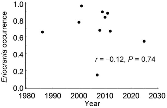 Long-term datasets spanning several decades are widely regarded as the most effective for identifying factors that shape insect population dynamics [21], yet many studies rely on much shorter time series [22,23] because extended monitoring records remain uncommon [24]. Against this backdrop, our periodic surveys of Eriocrania moths in St. Petersburg, Russia (1986–2025), represent an exceptionally rare dataset that combines nearly four decades of continuity with substantial spatial replication.