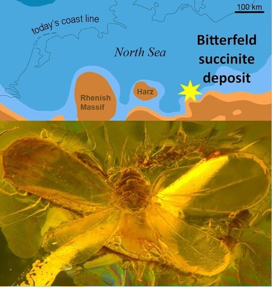- Barthel, M.; Hetzer, H. Bernstein-Inklusen aus dem Miozän des Bitterfelder Raumes. Z. Angew. Geol. 1982, 28, 314–336. [Google Scholar]