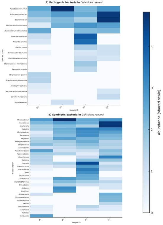 Figure 3. Pathogenic and symbiotic bacteria associated with C. reevesi. (A) Heatmap showing the relative abundance (log-transformed values) of potentially pathogenic bacterial species detected in different pooled samples (1EL, 2EL, 3EL, and 5EL). (B) Heatmap illustrating the distribution of symbiotic bacterial genera across the same pools. Color intensity reflects relative abundance, with darker shades indicating higher abundance.