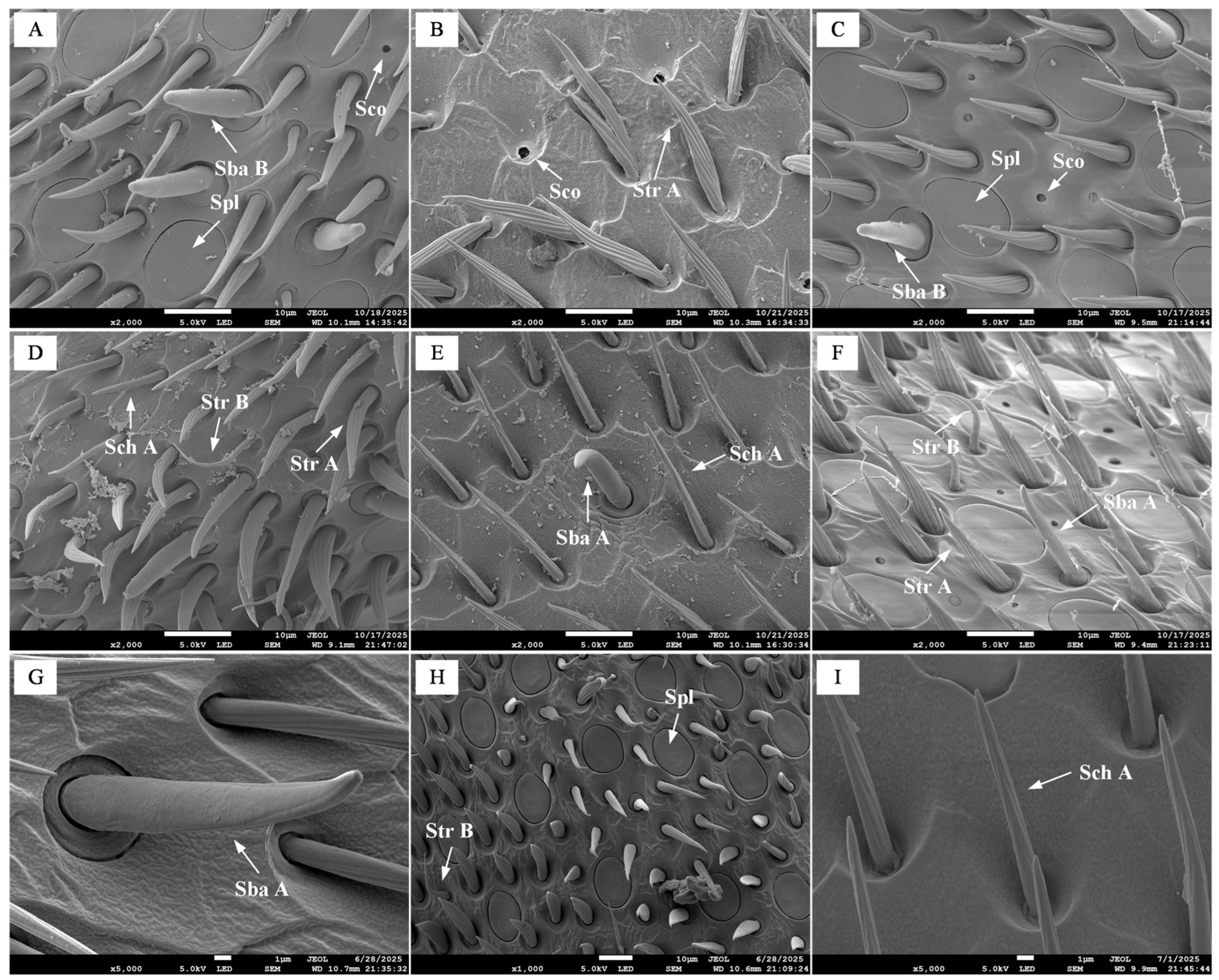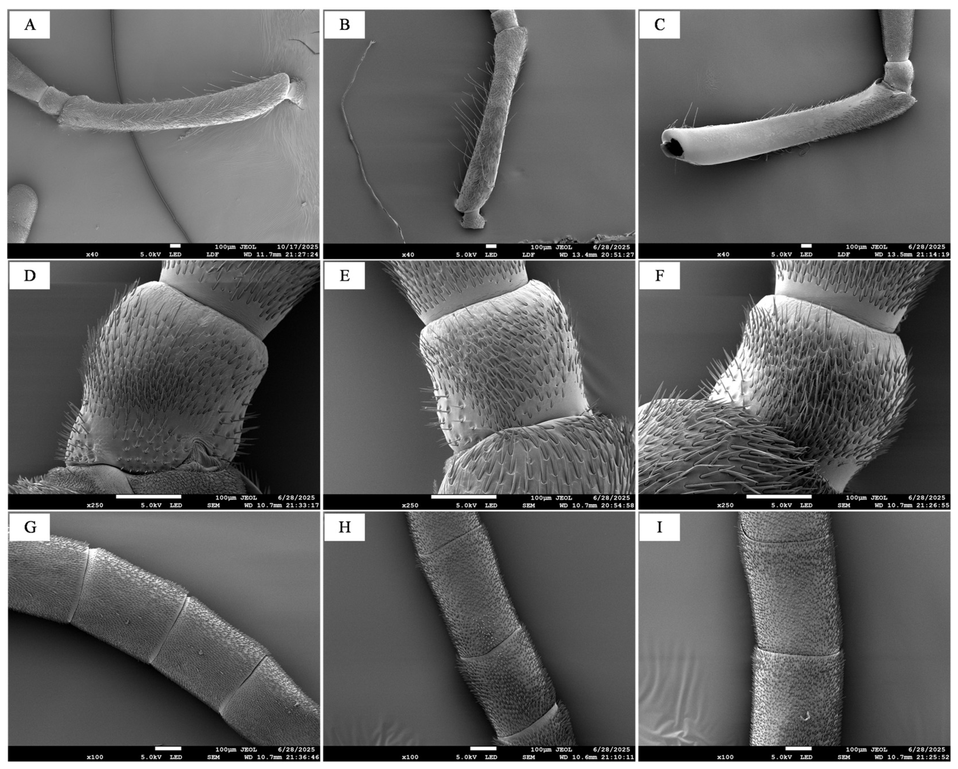 SEM images were processed using Microsoft Visio 2024 (Microsoft Corporation, Redmond, WA, USA) to optimize global contrast and unify the background without altering the original morphological features. Antennal parameters were measured using ImageJ software, version 1.54 g (National Institutes of Health, Bethesda, MD, USA).