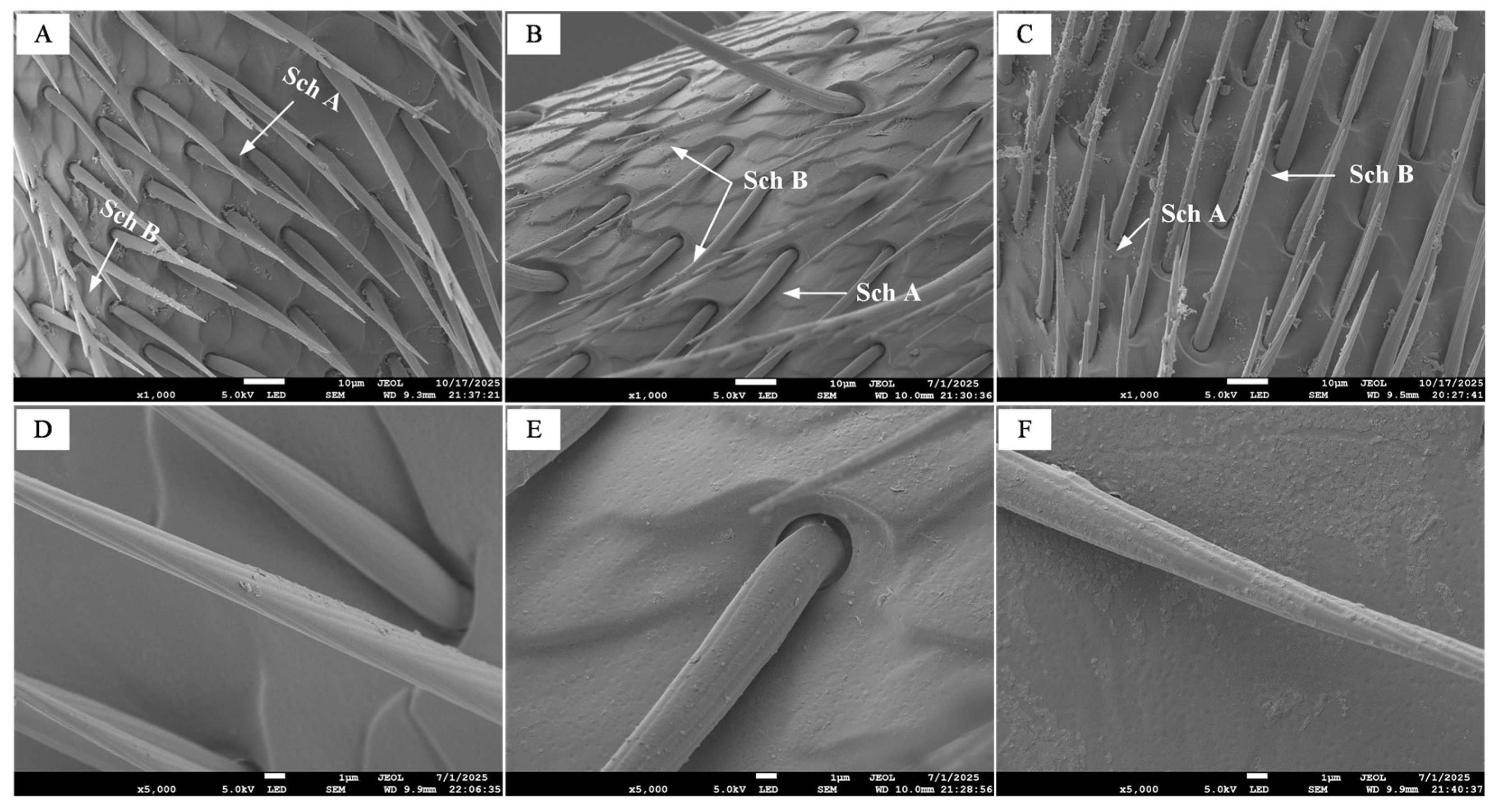 Sch were identified on the scape, pedicel, and flagellum of workers, drones, and queens. Previous studies indicate that this type of sensilla possesses dual functionality in both mechanoreception and contact chemoreception [