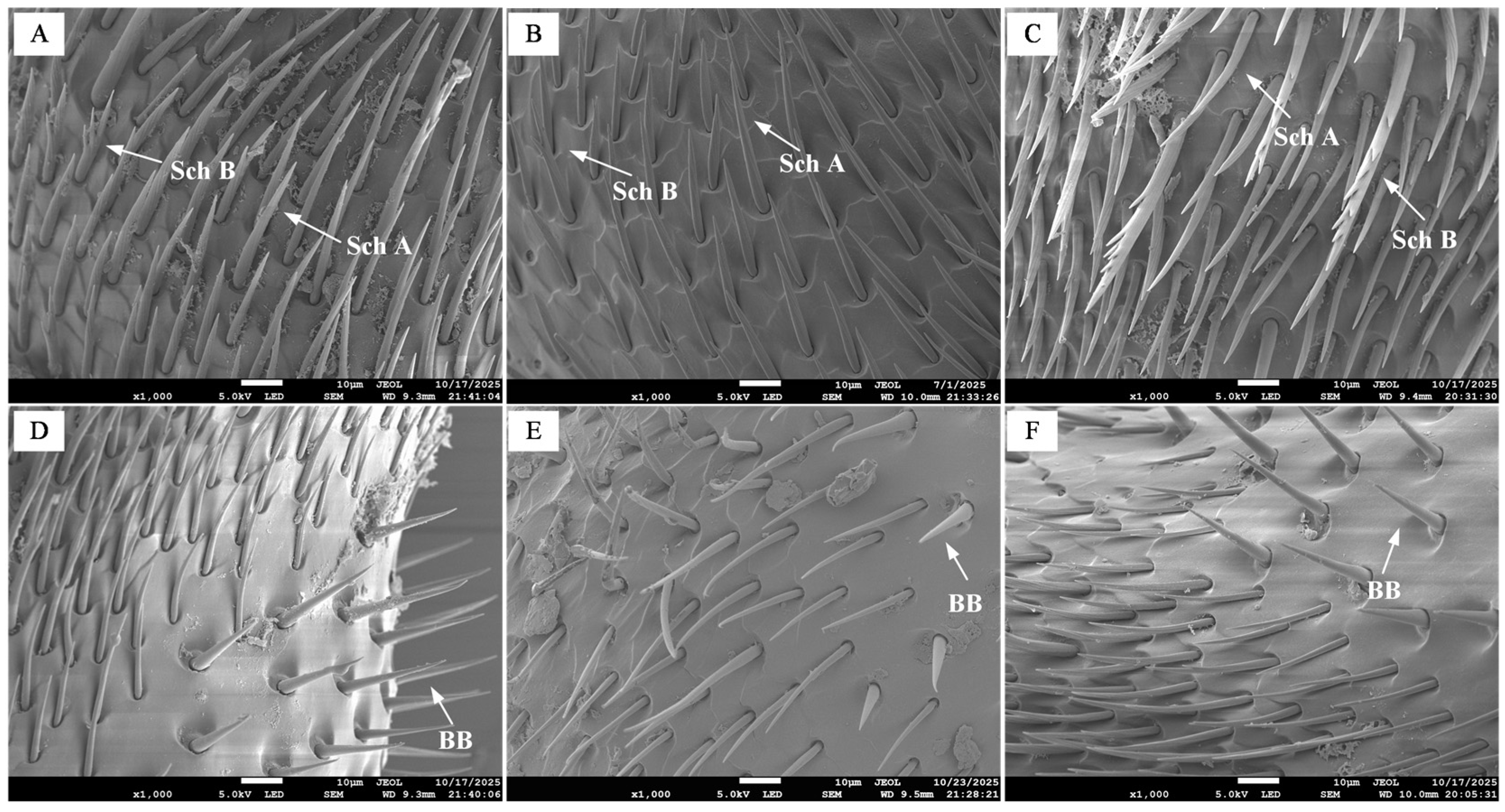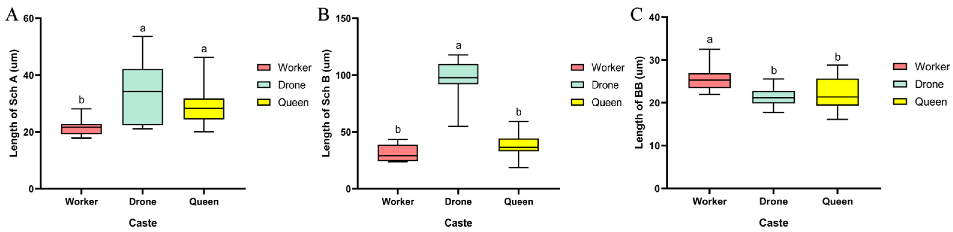 14]. Our study revealed that the length of Sch on all antennal segments of drones was significantly greater than that of workers and queens. This morphological difference likely reflects their heightened need for perceiving chemical or mechanical signals during antennal contact, potentially functioning in mating behavior or the recognition of queen cuticular cues. Compared to the scape, BB were present on the pedicel of all three castes, with workers exhibiting significantly greater bristle length than drones and queens. Previous research has established that BB function as proprioceptors, sensing antennal spatial position and regulating its movement [