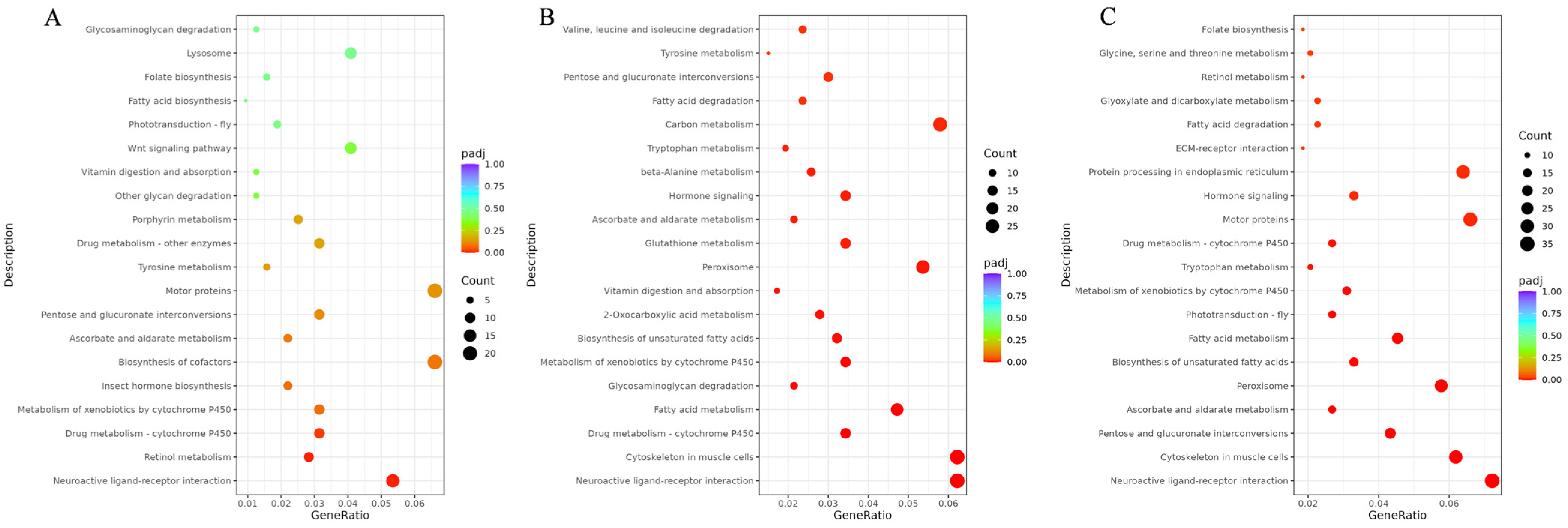 Thirty workers, males, and queens of B. terrestris were respectively collected. After anesthetizing on ice overlaid with tin foil, their heads (including antennae) were excised, immediately frozen in liquid nitrogen, and stored at −80 °C. Total RNA was extracted from the bumblebee heads using a Trizol reagent kit. Three independent RNA samples were prepared for each caste: each worker sample (designated W_CJ_1 to W_CJ_3) pooled heads from 5 workers, each male sample (D_CJ_1 to D_CJ_3) pooled heads from 5 males, and each queen sample (Q_CJ_1 to Q_CJ_3) pooled heads from 5 queens. RNA purity and concentration were measured using a NanoDrop 2000 spectrophotometer (Thermo Fisher Scientific, Waltham, MA, USA), while RNA integrity was precisely assessed with an Agilent 2100 Bioanalyzer (Santa Clara, CA, USA). Only samples passing quality control were subjected to transcriptome sequencing.
