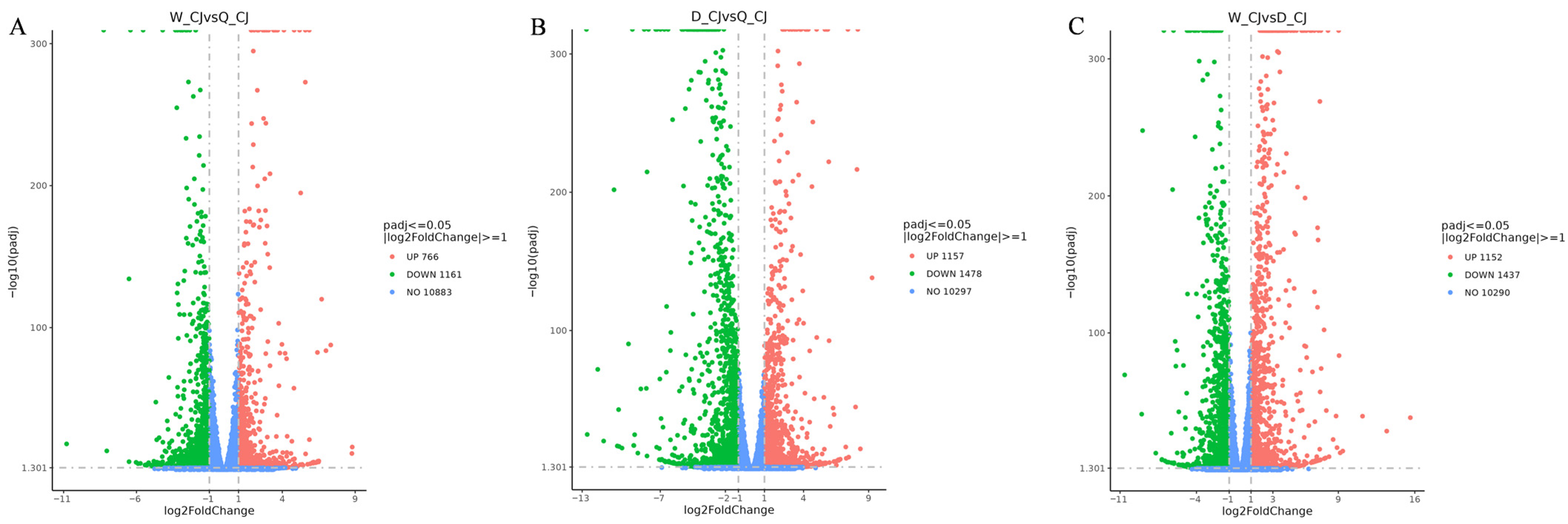High-quality total RNA that passed quality control was used for mRNA enrichment with oligo(dT)-coupled magnetic beads. The enriched mRNA was fragmented, and first-strand cDNA was synthesized using random primers. Second-strand cDNA synthesis was then performed in a reaction system containing buffer, dNTPs, RNase H, and DNA polymerase I. The resulting double-stranded cDNA products were purified using AMPure XP beads (Beckman Coulter, Inc., Brea, CA, USA). The cDNA ends were blunted using the synergistic action of T4 DNA polymerase and Klenow DNA polymerase, followed by 3′ adenylation and adapter ligation. The ligated products were subsequently size-selected with AMPure XP beads. The second cDNA strand was selectively degraded using Uracil-Specific Excision Reagent (USER) enzyme, and the resulting library was amplified via PCR to construct standardized sequencing libraries. After passing quality inspection, the libraries were sequenced on an Illumina NovaSeqTM 6000 platform (San Diego, CA, USA) using a paired-end 150 bp (PE150) read length configuration for data acquisition. The transcriptome sequencing service was provided by Beijing Novogene Co., Ltd. (Beijing, China), and the raw sequencing data have been deposited in the NCBI SRA database under accession number PRJNA1345014.