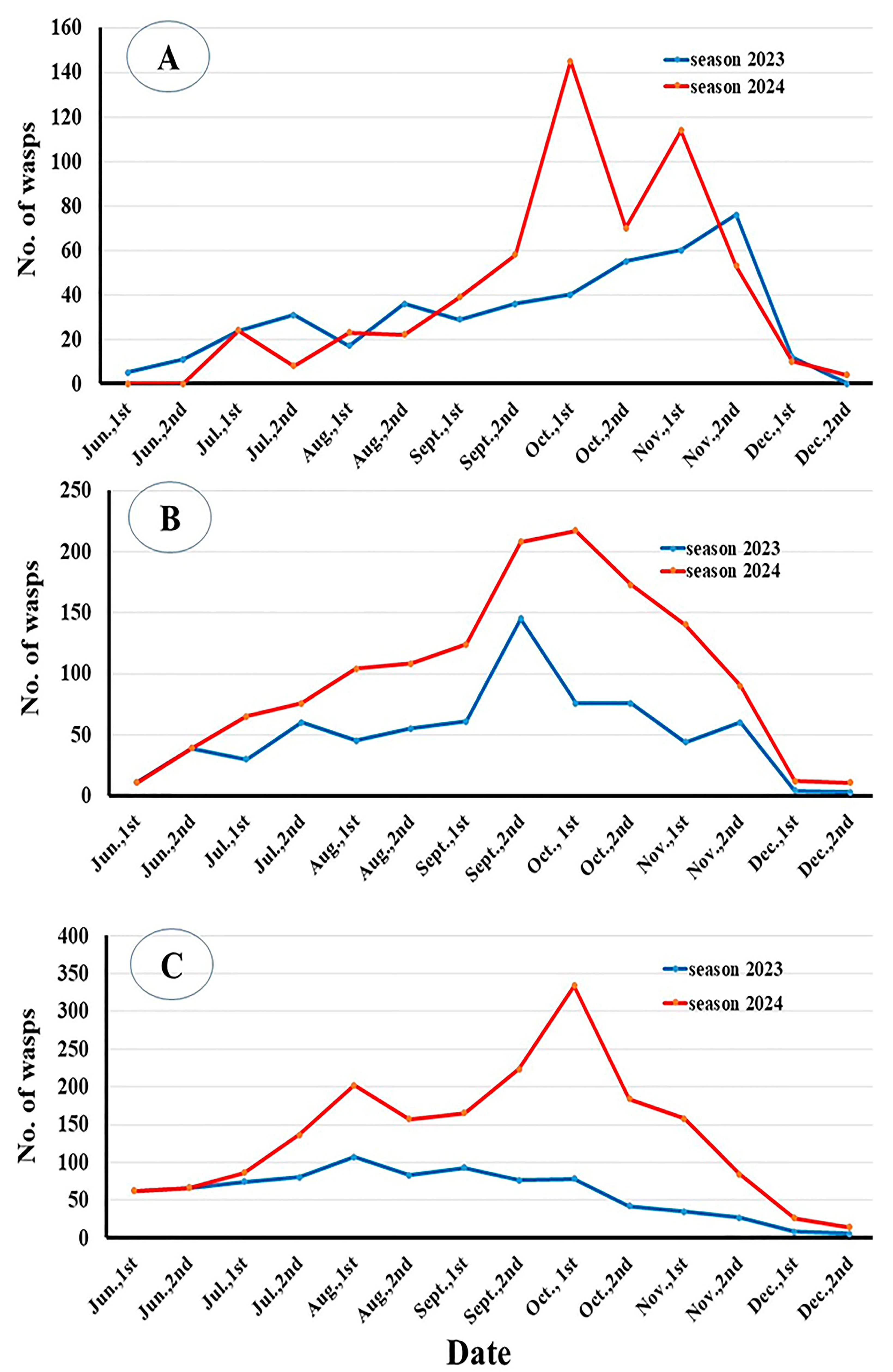 3.1. Seasonal Abundance of Vespa orientalis L. At Three Apiaries During Two Successive Seasons, 2023 and 2024