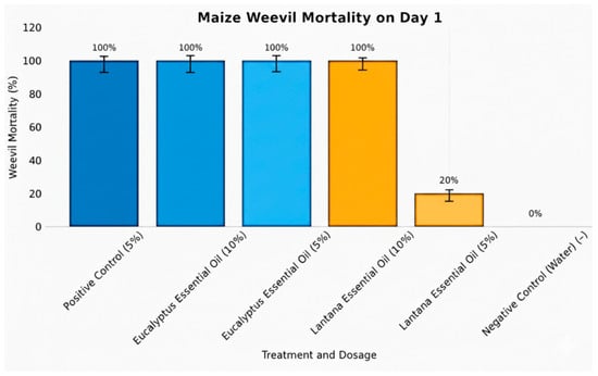 The contact toxicity of L. camara and E. globulus essential oils against Sitophilus zeamais was evaluated using a topical application assay. Measured volumes of essential oil (0.5 mL and 1 mL) were evenly applied to 10 g of sterilized maize grains (w/w) and transferred into sterile Petri dishes. Five adult weevils (5–10 days old) were introduced per dish, and each treatment was replicated three times. Malathion-treated maize served as a positive control, while untreated maize served as a negative control. Mortality was recorded daily over a 10-day exposure period. Weevils were considered dead if no movement was observed when gently probed with a fine needle. The assay allowed assessment of dose-dependent insecticidal effects of essential oils in comparison to conventional chemical control.