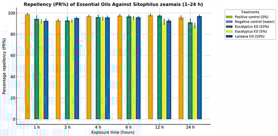 Bar graph showing the repellence (PR%) of essential oils against Sitophilus zeamais across the 1–24 h exposure intervals.