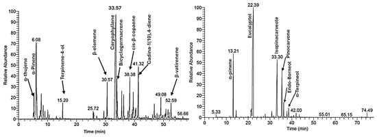 GC-MS chromatogram of essential oils extracted from L. camara (left) and E. globulus (right) leaves.