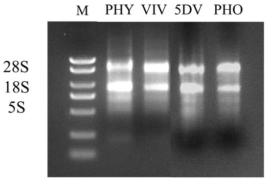 A: Electrophoresis of total RNA from different life stages of mites (PHY: 72 h physogastry; VIV: viviparous; 5DV: 5 d viviparous; PHO: phoresy, M. alternatus carried for 15 d).