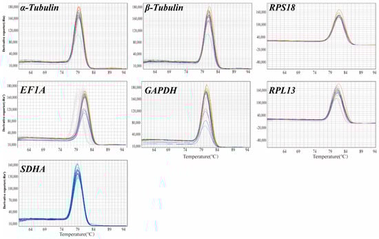 The melting curve analysis achieved via qRT-PCR (Figure 2) demonstrated that the seven candidate reference genes (α-tubulin, β-tubulin, RPS18, RPL13, GAPDH, EF1A, and SDHA) exhibited no additional peaks beyond the primary peak, exhibiting excellent specificity. The amplification efficiency (E) was subsequently calculated and ranged from 90% to 102%, suggesting the efficacy of the RT-qPCR reaction (Table 1). Consequently, subsequent experiments could be conducted.