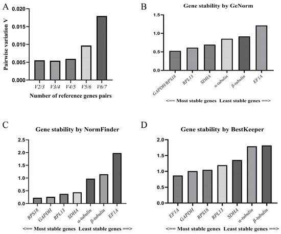 The coefficient of variation analysis in the GeNorm software showed that the Vn/Vn + 1 values of the seven candidate reference genes were all less than 0.15 (V2/V3 = 0.005), and the minimum value taken to determine the number of candidate reference genes was 2 (Figure 4A). The stability of the candidate reference genes was ranked in descending order as follows: GAPDH/RPS18 > RPL13 > SDHA > α-tubulin > β-tubulin > EF1A. Thus, GAPDH and RPS18 were the most stable reference genes according to this procedure, followed by RPL13 and SDHA, while EF1A was the most unstable reference gene (Figure 4B). These are similar to the results obtained via the ΔCt procedure.