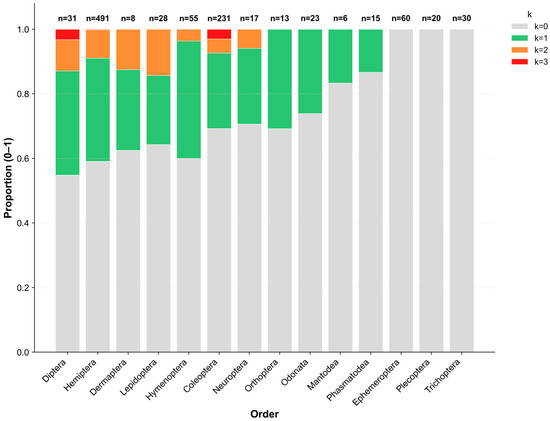 Proportional distribution of co-infection counts (k = 0–3) across 14 insect orders. Bars represent the proportion of individuals within each order carrying 0, 1, 2, or 3 sex-manipulating endosymbiont species, respectively. Color intensity indicates the number of co-infected symbionts. The numbers above the bars show the number of individuals analyzed per order (n).