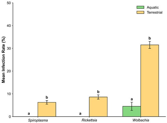 Comparison of infection prevalence for three endosymbionts (e.g., Spiroplasma, Rickettsia, and Wolbachia) between aquatic and terrestrial insect groups (Mann–Whitney U test, p < 0.05).
