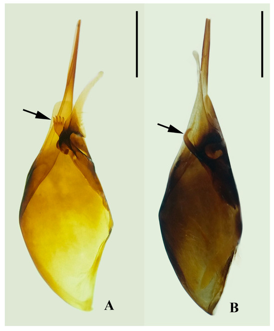 | Projection on gonocoxite * | Two to five apical projections | With one simple apical projection |