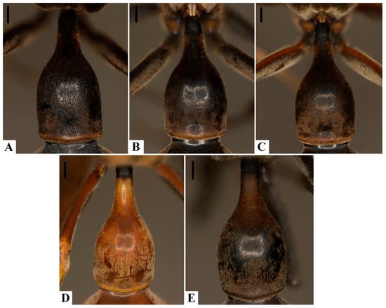 - Barroso, P.C.S.; Menezes, R.S.T.; Oliveira, M.L.; Somavilla, A. A systematic review of the Neotropical social wasp genus Angiopolybia Araujo, 1946 (Hymenoptera: Vespidae): Species delimitation, morphological diagnosis, and geographical distribution. Arthropod Syst. Phylogeny 2022, 80, 75–97. [Google Scholar] [CrossRef]