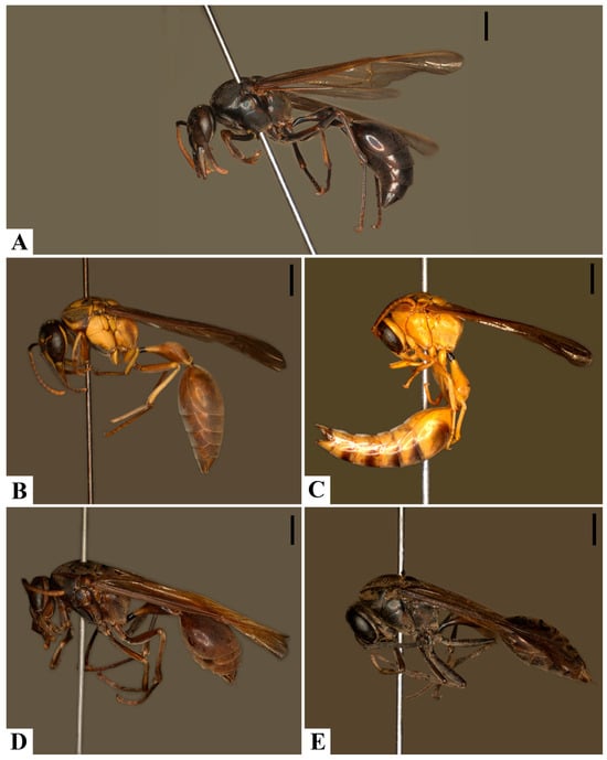- Somavilla, A.; Barroso, P.C.S.; Aragão, M.; Mateus, S.; Menezes, R.S.T. An integrative taxonomic and phylogenetic approach reveals a new Neotropical swarm-founding social wasp, Pseudopolybia cryptica sp. n. (Vespidae: Polistinae: Epiponini). Arthropod Syst. Phylogeny 2021, 79, 25–35. [Google Scholar] [CrossRef]