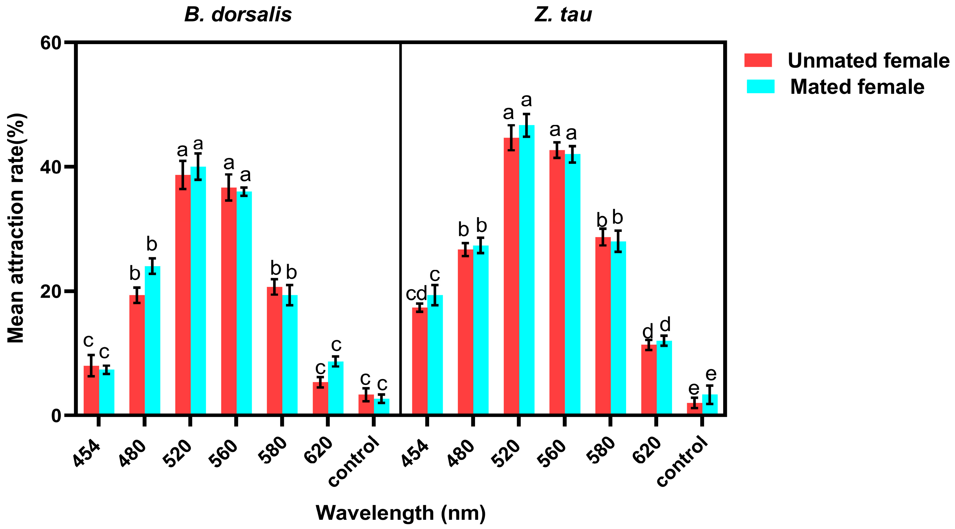 2.4. Responses of B. dorsalis and Zeugodacus tau to Varied Wavelengths in Laboratory Conditions