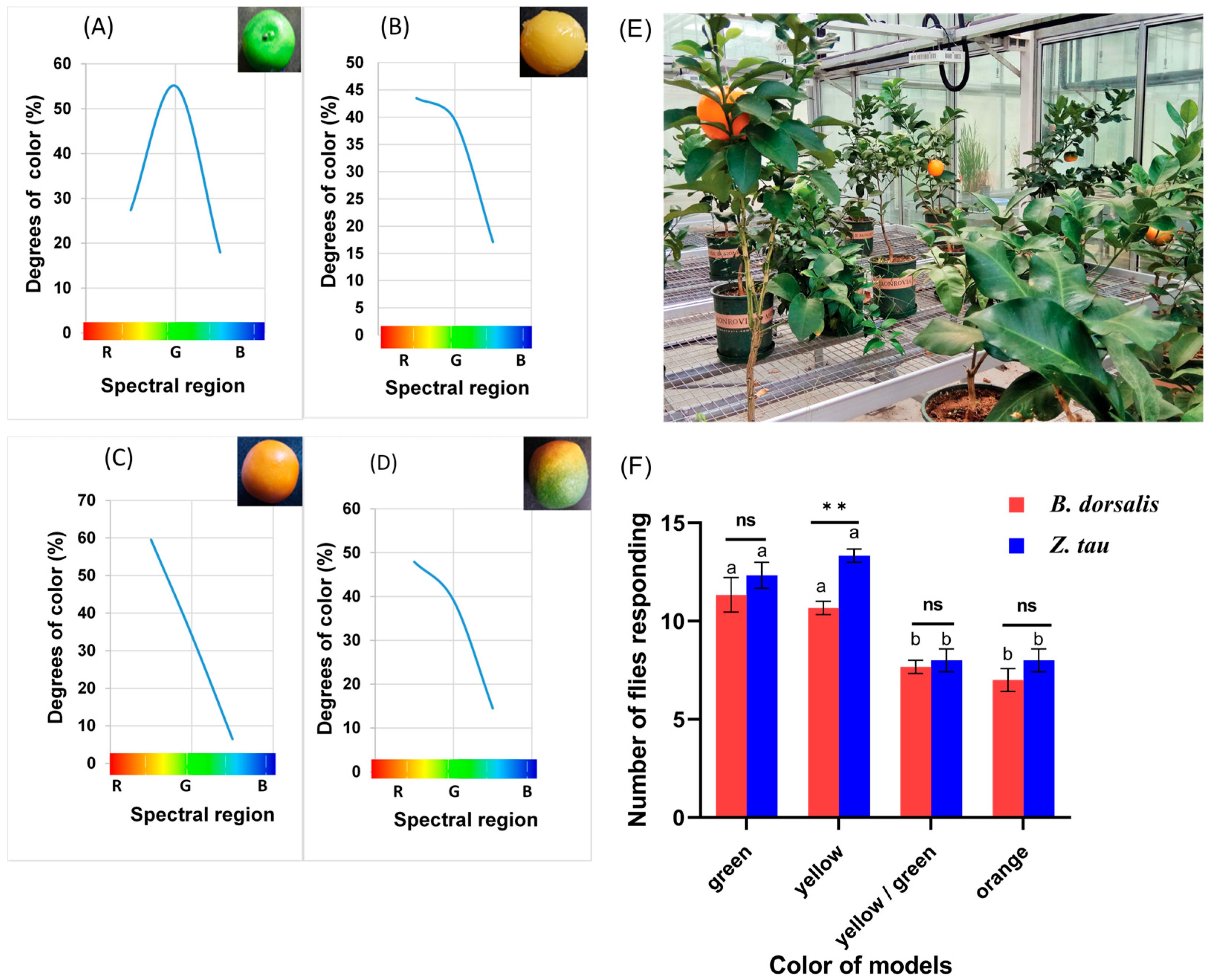 - Wu, W.-Y.; Chen, Y.-P.; Yang, E.-C. Chromatic cues to trap the oriental fruit fly, Bactrocera dorsalis. J. Insect Physiol. 2007, 53, 509–516. [Google Scholar] [CrossRef] [PubMed]