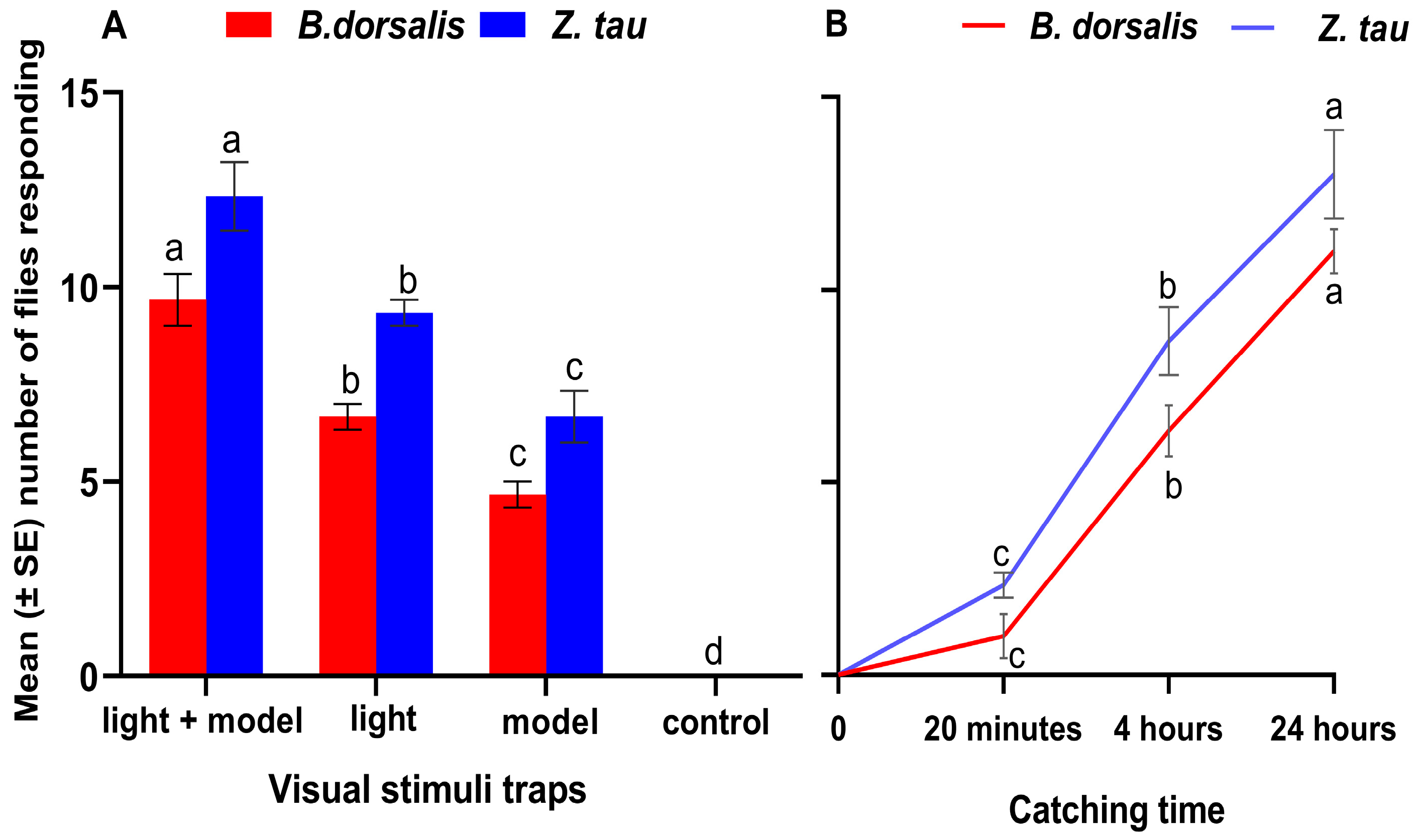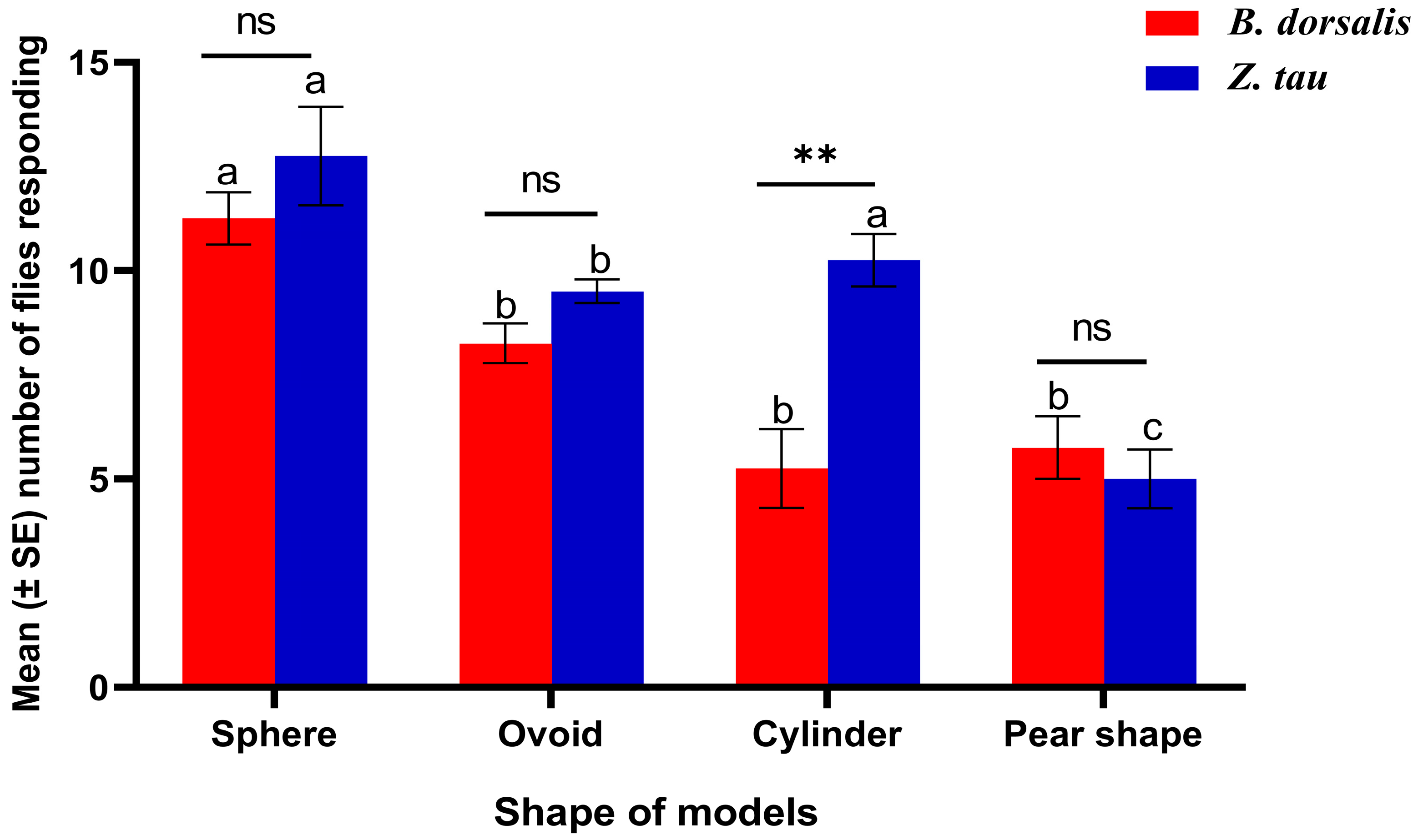 APA StyleNaiem, F. A., Zheng, W., Haider, K., Kabir, K., Afzal, I., & Zhang, H. (2026). Investigating the Disparity in Visual Stimuli-Induced Behavioral Responses Between Bactrocera dorsalis and Zeugodacus tau (Diptera: Tephritidae). Insects, 17(1), 8. https://doi.org/10.3390/insects17010008