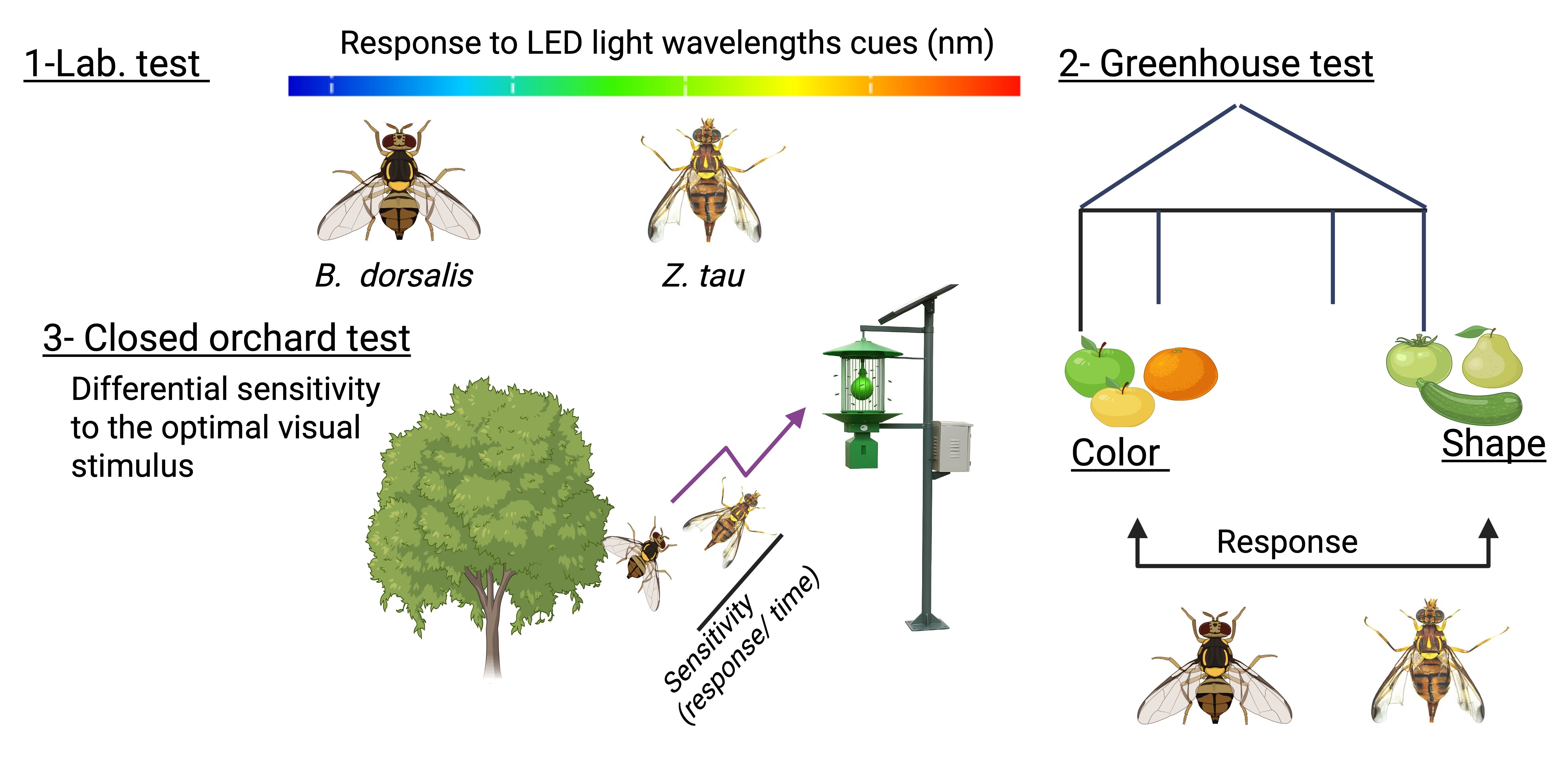 Tephritid flies employ visual and chemical cues to locate and assess suitable habitats, food sources, mating sites, and ovipositional resources. Bactrocera dorsalis and Zeugodacus tau are economically significant pests that infest a wide range of fruits and fleshy vegetables. Understanding their visual sensitivity is crucial for developing effective and ecologically friendly management strategies. Thus, in this study, we compare the responses of these two species to various visual stimuli across laboratory, greenhouse, and closed-orchard environments. Our experiments reveal that, across the tested physiological states, both species exhibit a preference for certain wavelengths in the laboratory, particularly 520 nm and 560 nm. In the greenhouse, green and yellow models captured significantly more females of both species. Z. tau females showed greater sensitivity to the yellow model than B. dorsalis females. Additionally, Z. tau showed a higher affinity for both spherical and cylindrical shapes, while B. dorsalis flies were only attracted to the spherical model. In a closed orchard area, traps modified according to the best-performing combination used in the laboratory and greenhouse (shape and light) increased the capture counts of both species over time, with Z. tau exhibiting greater visual attraction sensitivity than B. dorsalis. These findings provide a theoretical and scientific foundation for improving trapping techniques targeting these two species.