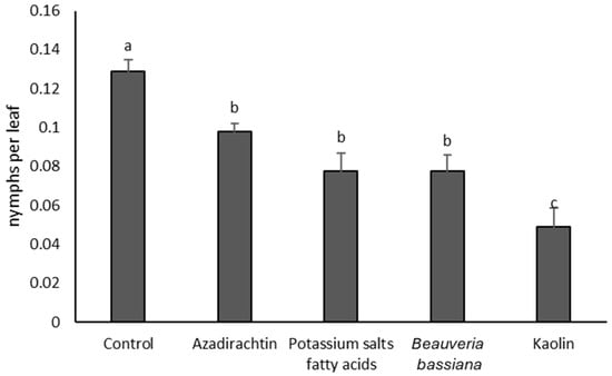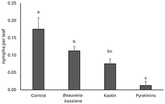 Densities (mean ± SE) of Scaphoideus titanus nymphs in the treatments compared in 2021. Different letters indicate significant differences among treatments (Tukey’s multiple comparison test on least-squares means, p < 0.05).