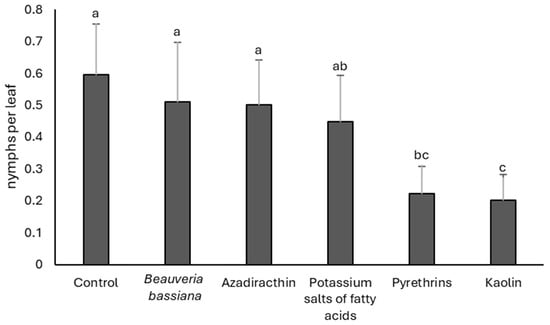 Densities (mean ± SE) of Scaphoideus titanus nymphs in the treatments compared in 2025. Different letters indicate significant differences among treatments (Tukey’s multiple comparison test on least-squares means, p < 0.05).