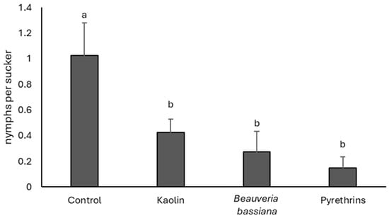 There were no differences in population densities among treatments before insecticide application (F = 1.95; df = 3, 9; p = 0.200). After insecticide application, the effect of treatment was significant (F = 6.55; df = 3, 9; p = 0.012). The highest S. titanus densities were found in the control plots (Figure 3), whereas the application of pyrethrins, kaolin, and B. bassiana was followed by a remarkable reduction in leafhopper numbers.