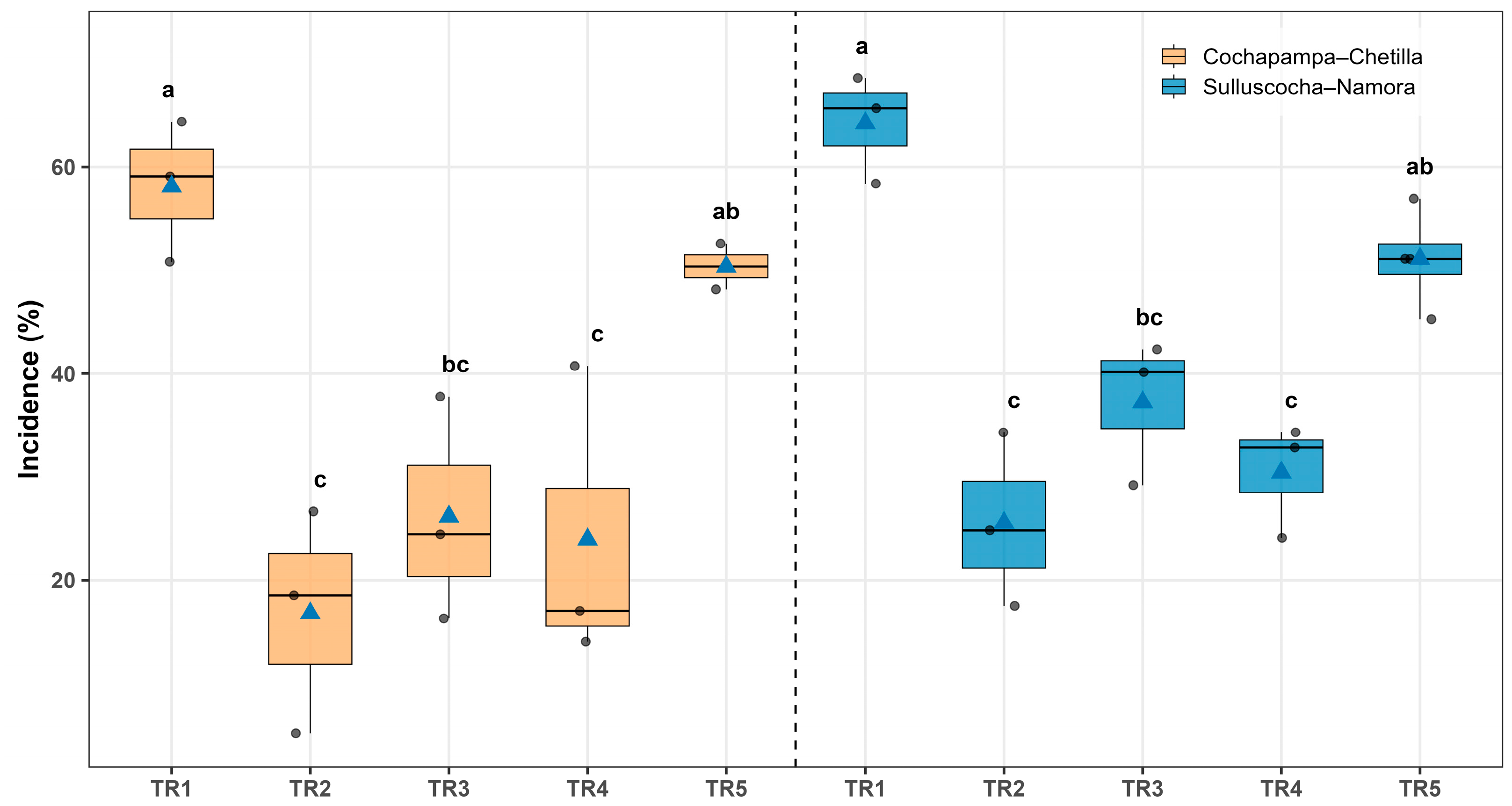 Figure 1. Incidence of potato tuber moth (Symmetrischema tangolias) damage in stored potato tubers under five treatments: TR1 (control), TR2 (Bacillus thuringiensis var. kurstaki plus industrial talc), TR3 (industrial talc), TR4 (agricultural lime), and TR5 (wood ash), evaluated in two localities: Cochapampa–Chetilla (orange) and Sulluscocha–Namora (blue). Boxes represent the interquartile range, the horizontal line inside each box indicates the median, blue triangles correspond to the mean, and grey dots represent individual observations. Different lowercase letters above the boxes denote significant differences among treatments according to the Šidák test (p < 0.05).