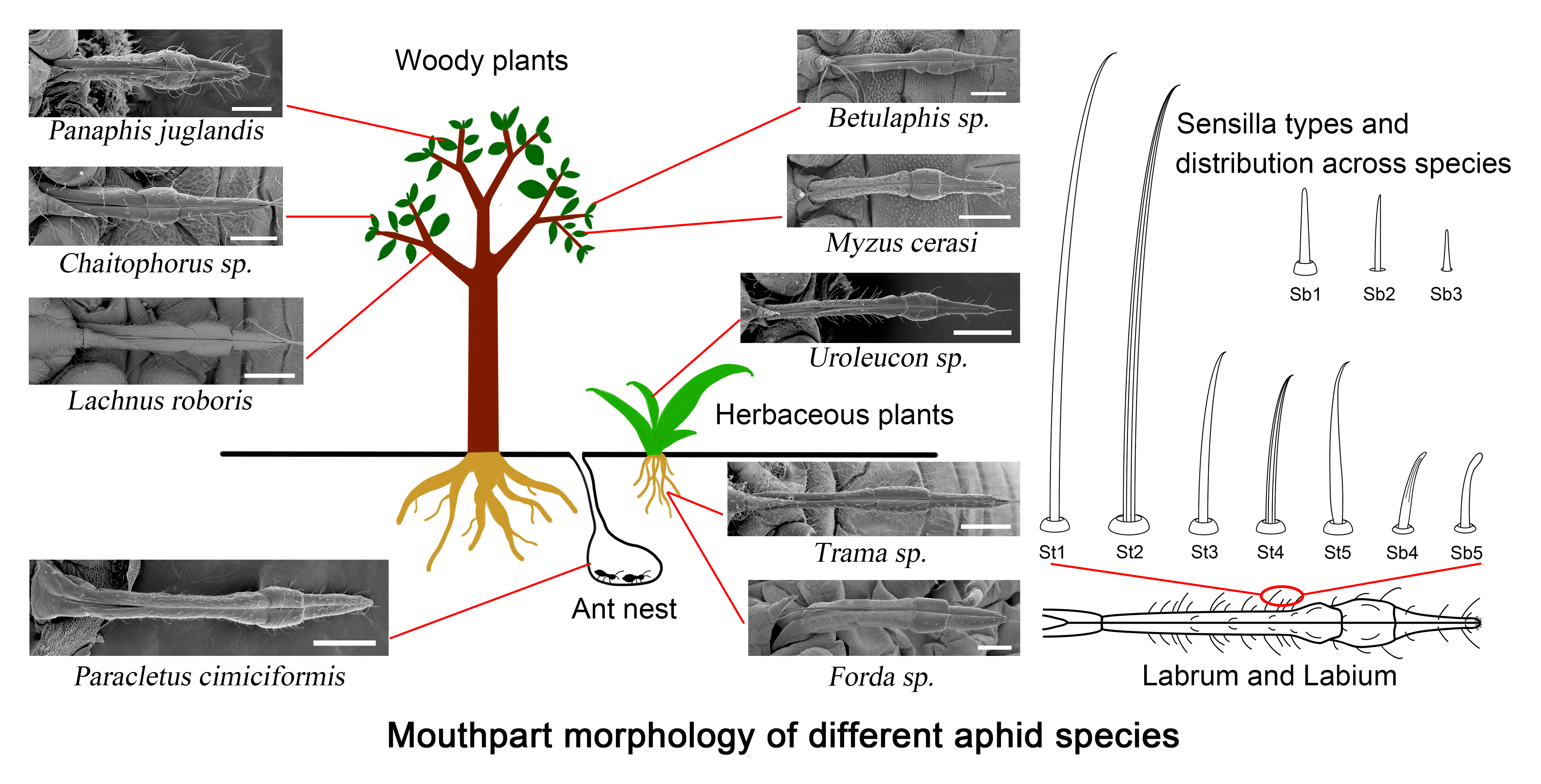 | Soft herbaceous shoots/leaves | Uroleucon sp., Glyphina betulae, Myzus cerasi Chaitophorus sp. | Short, 4-segmented labium; moderate or sparse ventral sensilla (trichodea 1/3, basiconica 1/3); banded spiniform tubercles in some. Optimised for gentle probing of thin epidermis. |