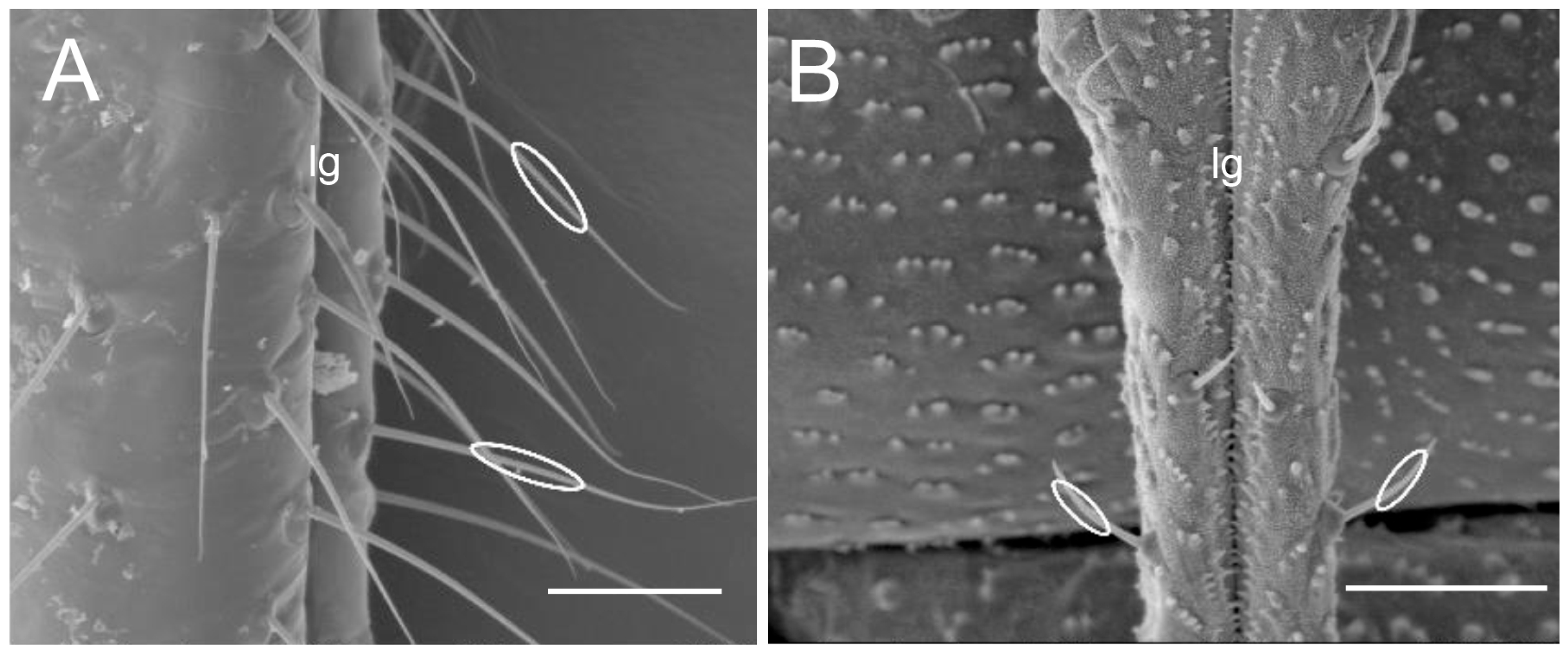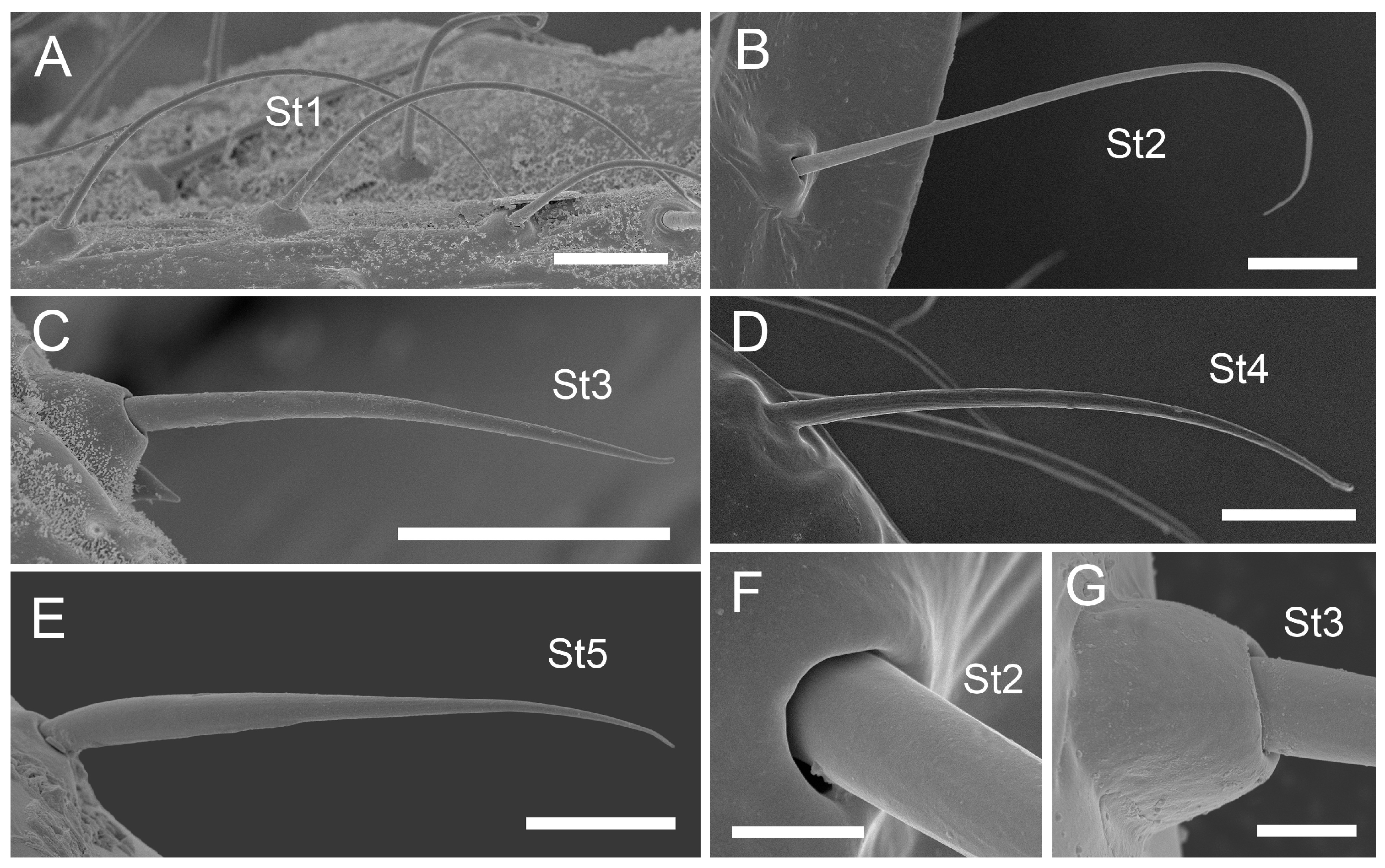 - Sensilla trichodea 1 (St1) and 2 (St2) are extremely slender, often with curved and sharply pointed tips, and are situated in sockets in hemispherical cuticular protrusions (Figure 3 and Figure 4A,B). These two types are morphologically similar; however, sensilla trichodea 2 can be distinguished by the presence of longitudinal grooves on their surface (Figure 3 and Figure 4B).