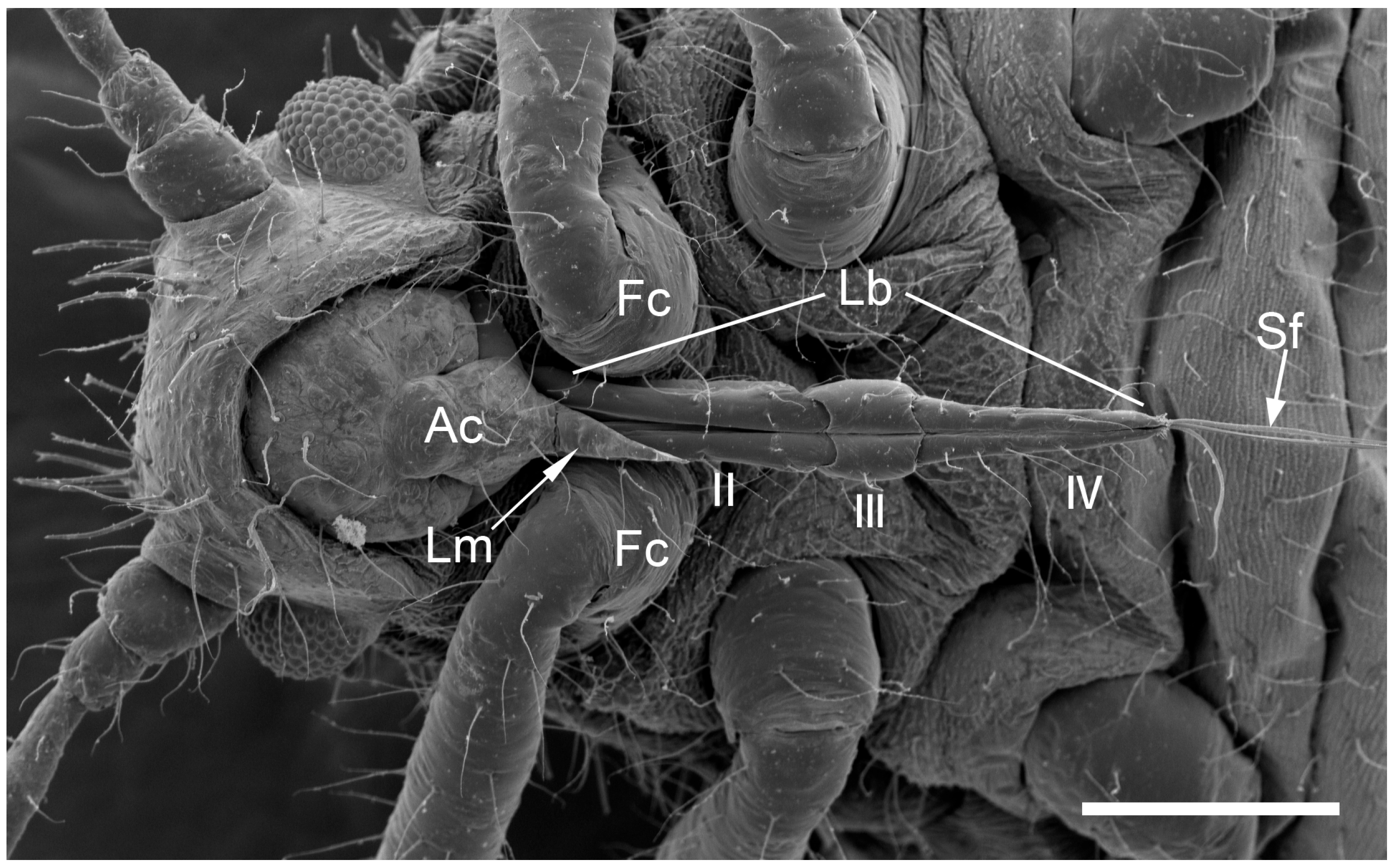 - Labrum (Figure 6A and Figure 7A): Approximately 188.5 μm in length and 43.2 μm in width at the base (Table 2), presenting a triangular shape with transverse folds on the surface but no sensilla. A pair of sensilla basiconica 1 (Sb1) (Figure 3) is present at the base of the labrum, closely adjoined to the lateral sides. The stylet bundle extends from the base of the labrum posterior side, and a groove is present to accommodate and secure the stylet fascicle (Sf).