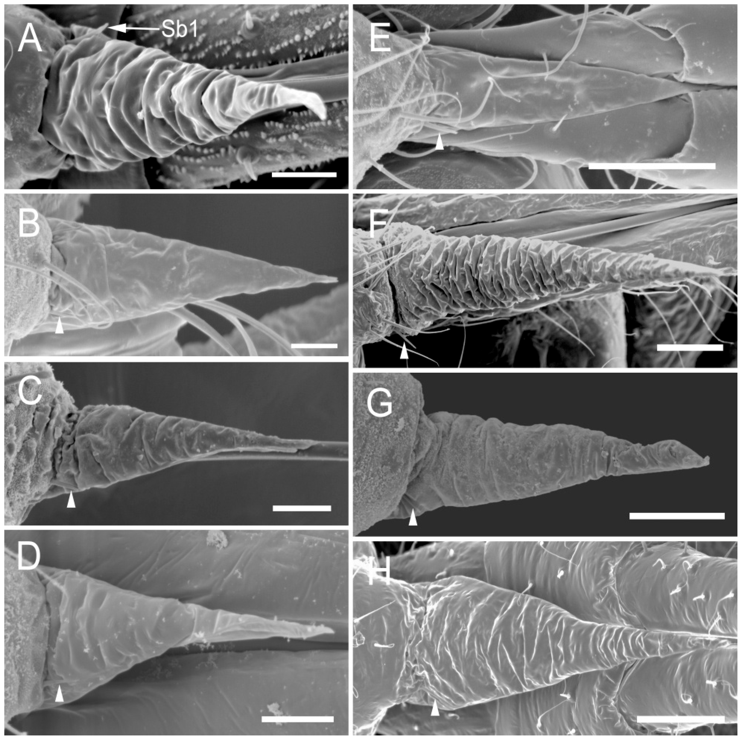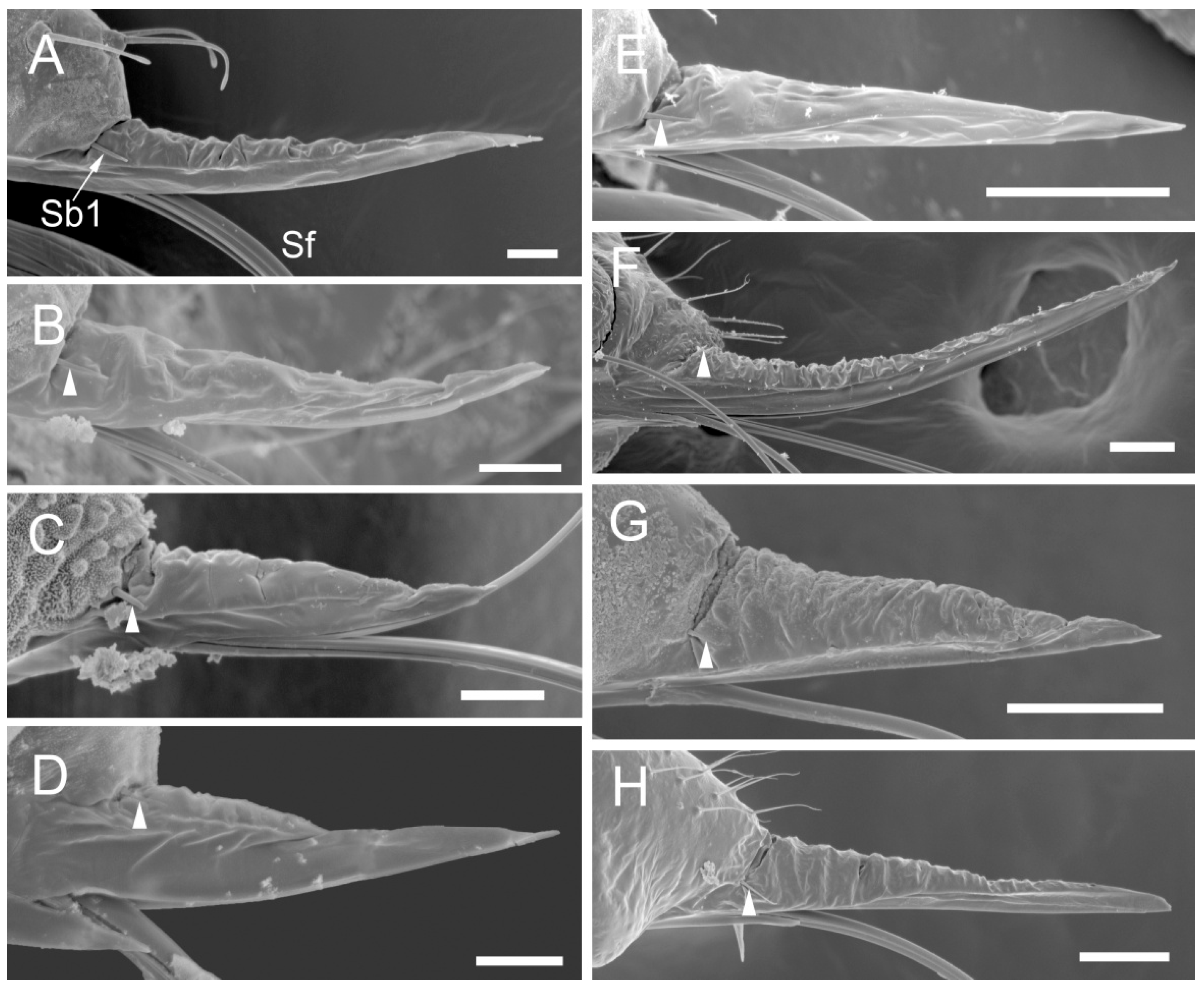 - Labrum (Figure 6G and Figure 7G): Approximately 185.2 μm in length and 52.2 μm in width at the base (Table 2), convex conical in shape, with surface folds but no sensilla. A pair of sensilla Sb1 is present at the base of the labrum (Figure 6G), closely adjoined to the lateral sides. The ventral surface is flat, with a groove accommodating the stylet fascicle (Figure 7G).