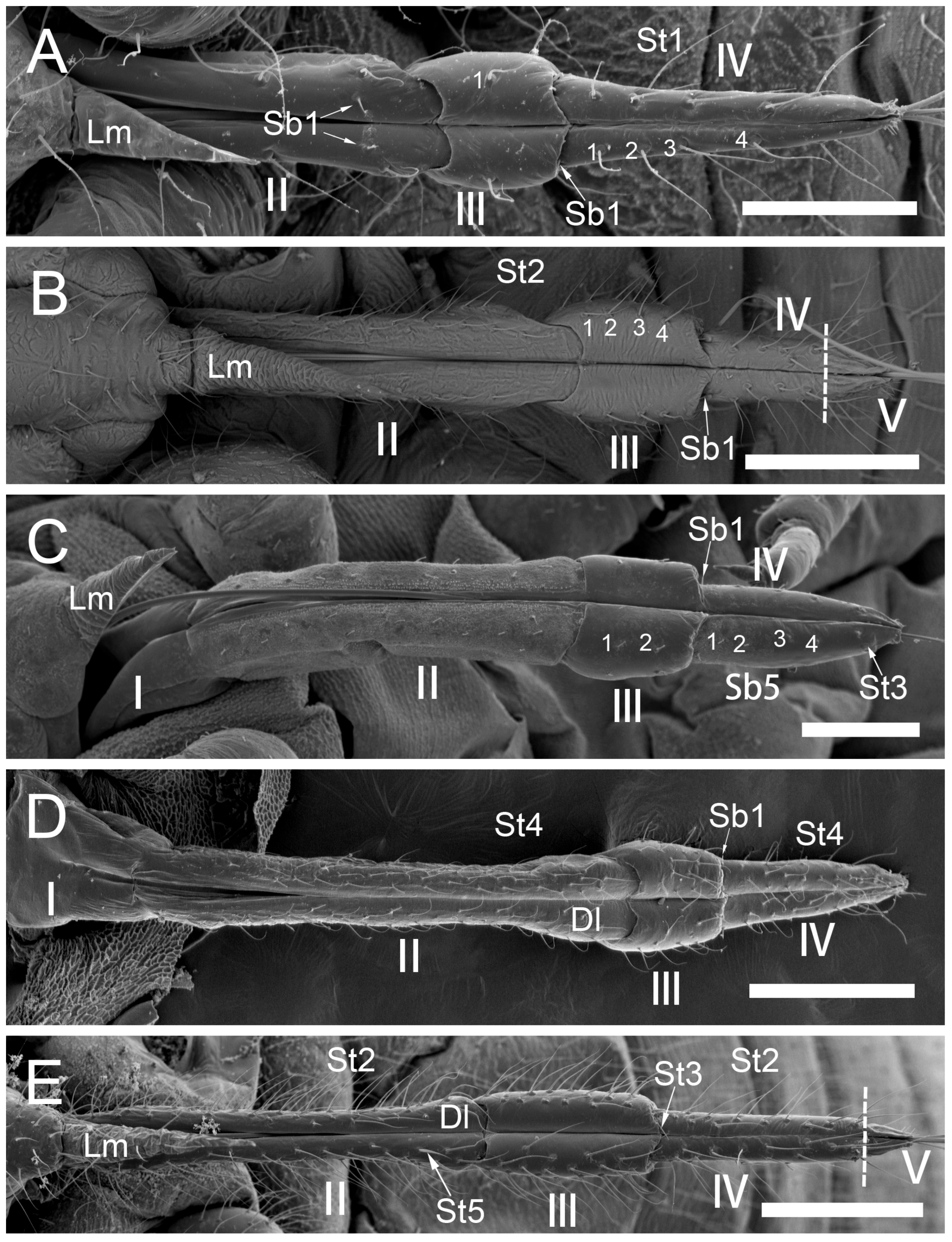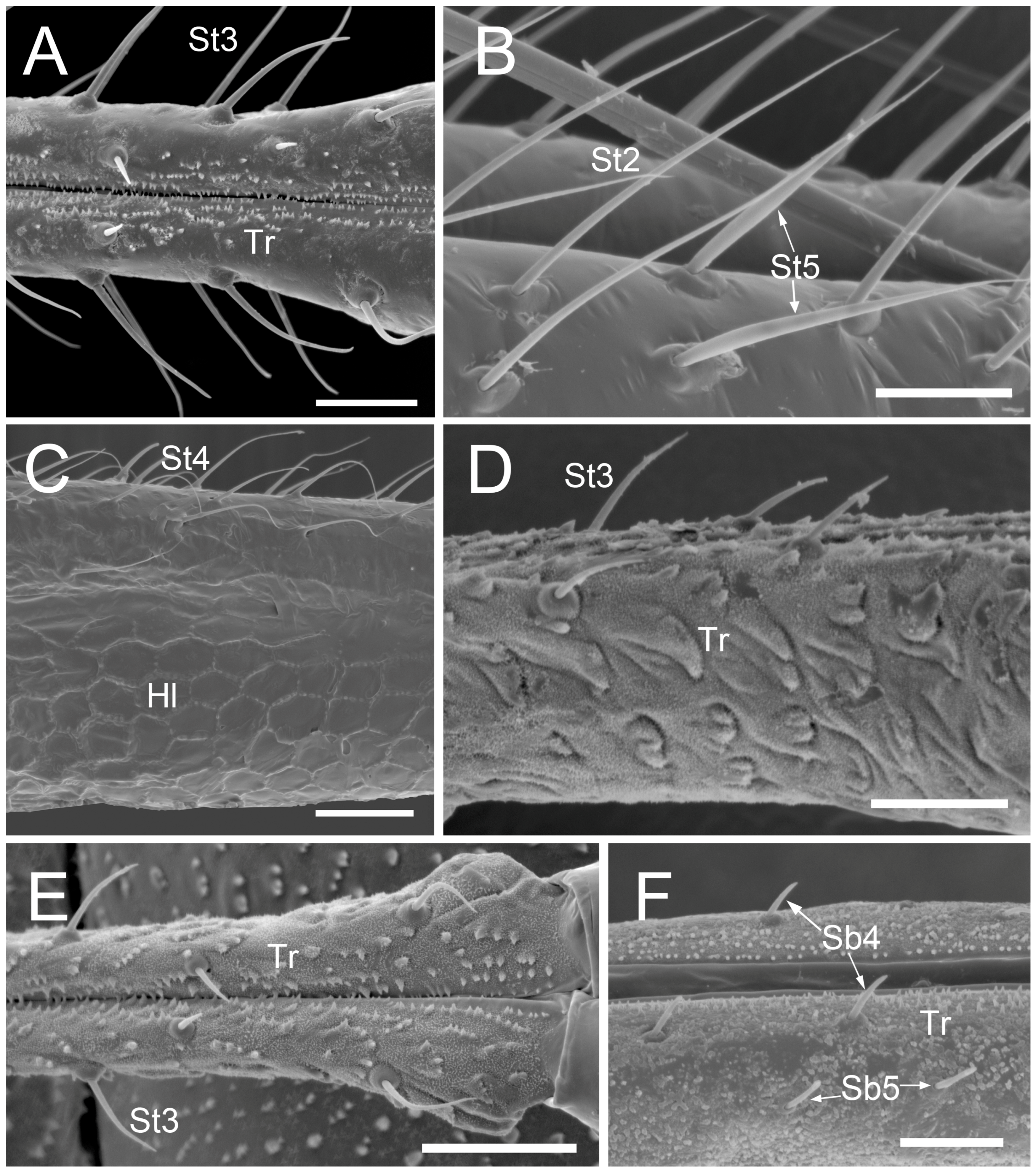 | Trama sp. | 1287.0 | 5 | 572.1 | Distal dilation dense, St2, St5 | 243.9 | Narrow, elongated, numerous, St2, St5 | 249.9 | Distal constriction, densely covered with St2, St3 = Sb1 St5 | Segment 2: Densely covered St2. 1 pair St5; Segment 3: 30 pairs St2, 2–3 pairs St5. Segment 4: Densely covered St2, 1–2 pairs St5. Segment 5: 7 pairs Sb2 |