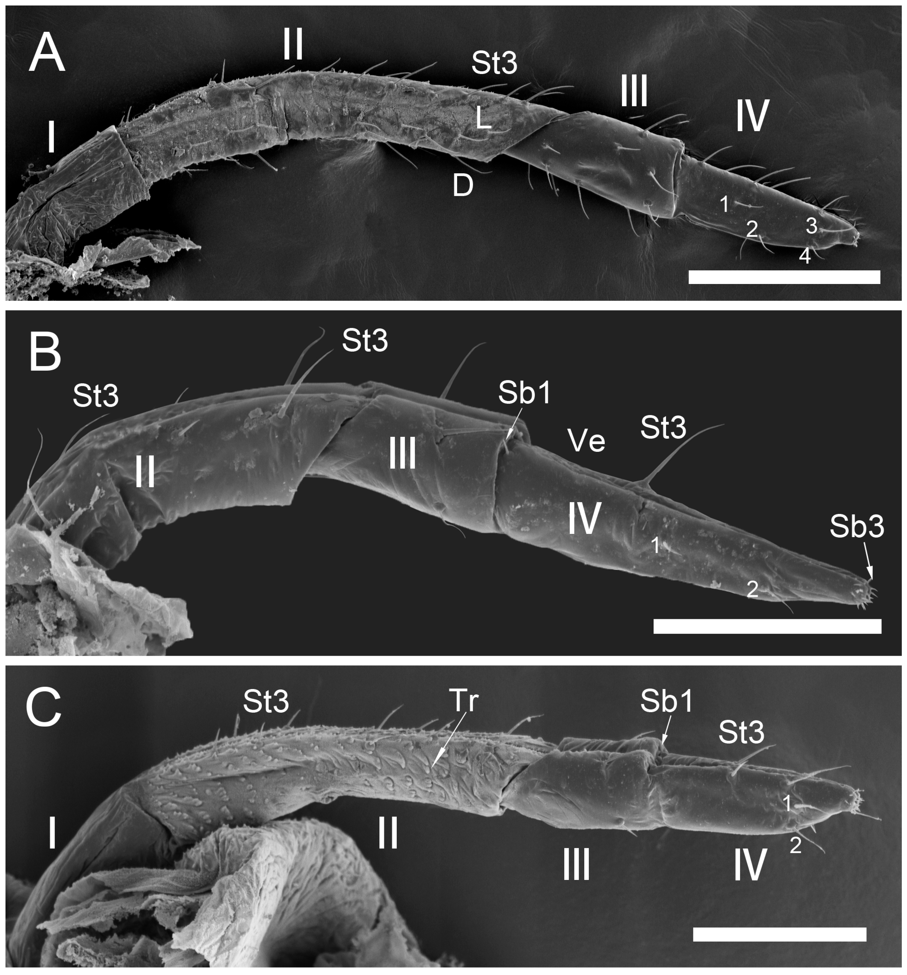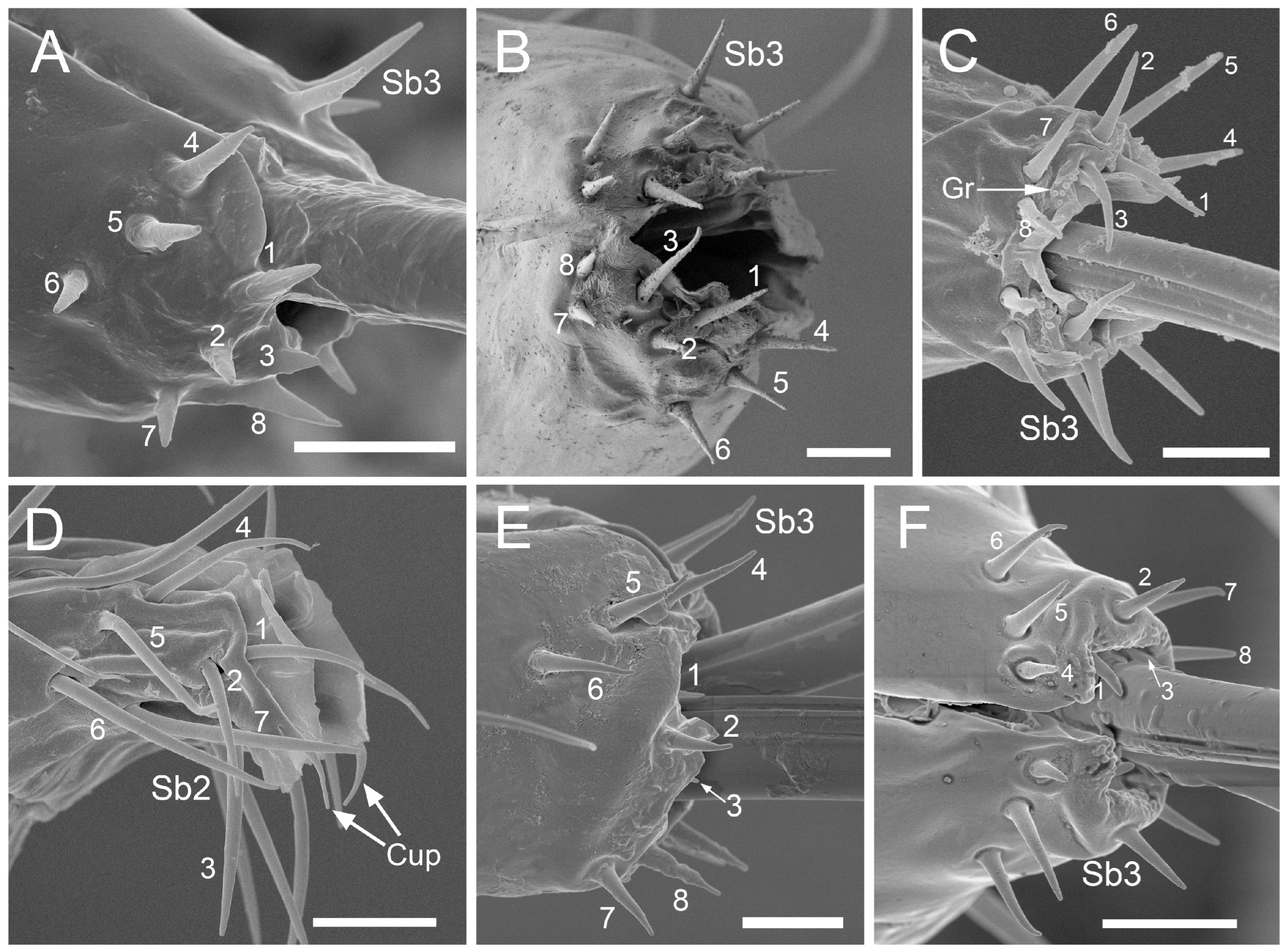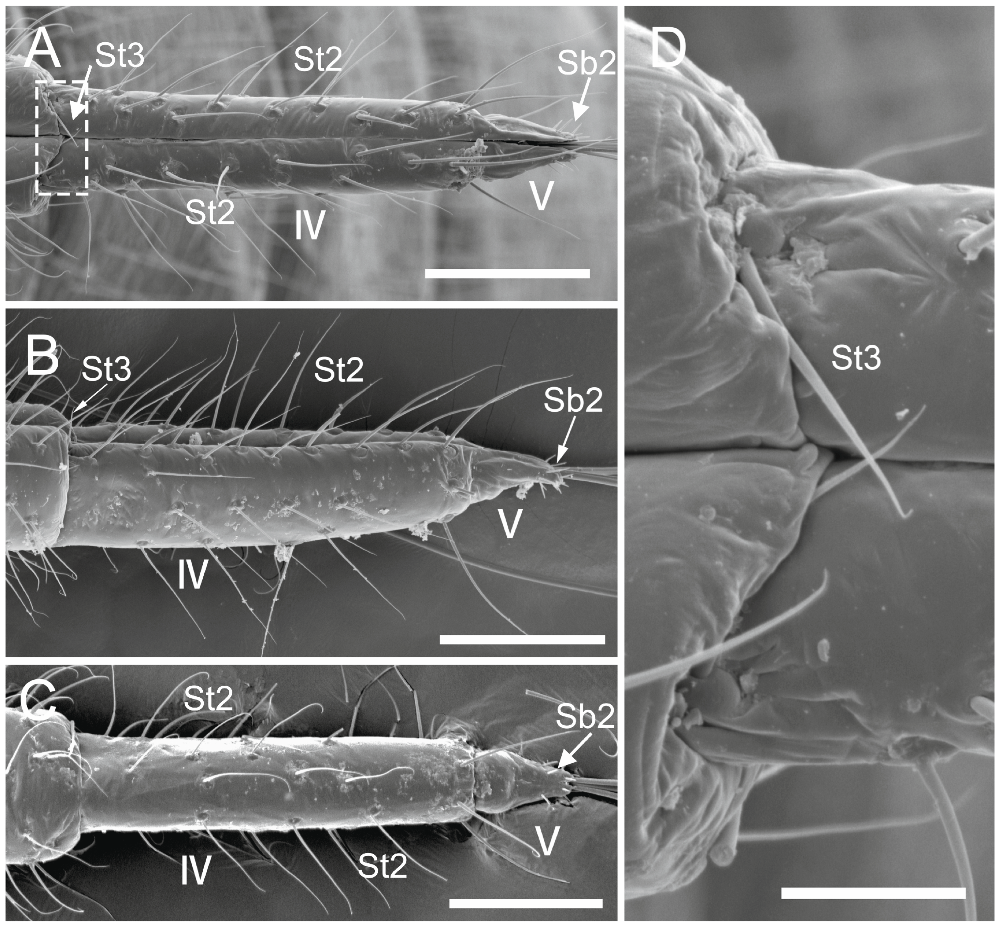 | L. roboris | 1446.0 | 5 | 883.9 | Soft, slight thickening, dense St2 | 228.9 | Abundant St2 | 200.6 | Distal constriction, numerous St2 | Segment 2: Numerous St2. Segment 3: 4 pairs St2. Segment 4: 14 pairs St2, Sb1, Sb3. Segment 5: Conical, 7 pairs Sb2 |