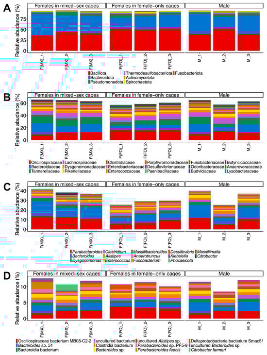 Taxonomic composition of gut bacterial communities in T. occipitalis. Relative abundances of bacterial communities are presented at (A) phylum, (B) family, (C) genus, and (D) species levels across three experimental groups: females from mixed-sex rearing (F(MX)), females from female-only rearing (F(FO)), and males (M). Each bar represents one biological replicate (n = 3 per group). Taxa that represent ≥1% of the community in at least one sample are shown for all samples, whereas taxa below 1% in all samples are not displayed.
