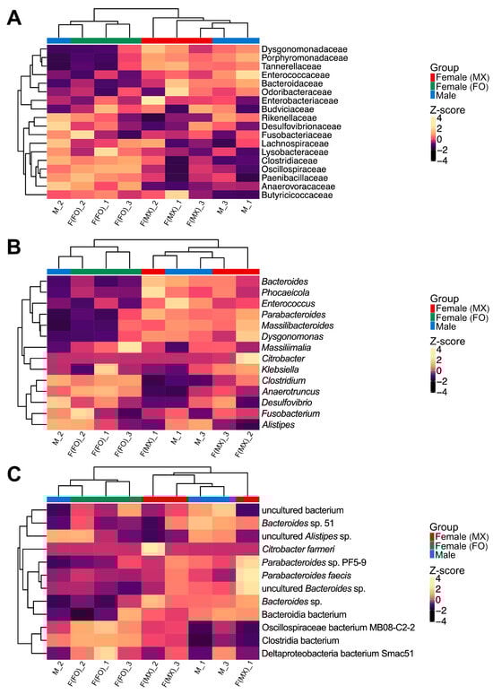 Hierarchical clustering analysis of gut bacterial communities. Heatmaps showing clustering patterns of bacterial relative abundances at (A) family, (B) genus, and (C) species levels across three experimental groups: females from mixed-sex rearing (F(MX)), females from female-only rearing (F(FO)), and males (M). Each column represents one biological replicate. Colors represent Z-score normalized abundances calculated per taxon across all samples, with lighter colors indicating higher relative abundances. Column annotation bars identify the experimental groups, with red indicating females from mixed-sex rearing, green indicating females from female-only rearing, and blue indicating males. Taxa that represent ≥1% of the community in at least one sample are shown for all samples, whereas taxa below 1% in all samples are not displayed.